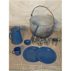 Large Tin Pot W/ Blue Porcelain Coffee Pot, Ladle,