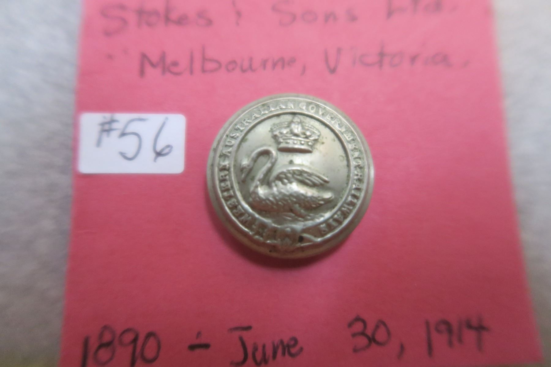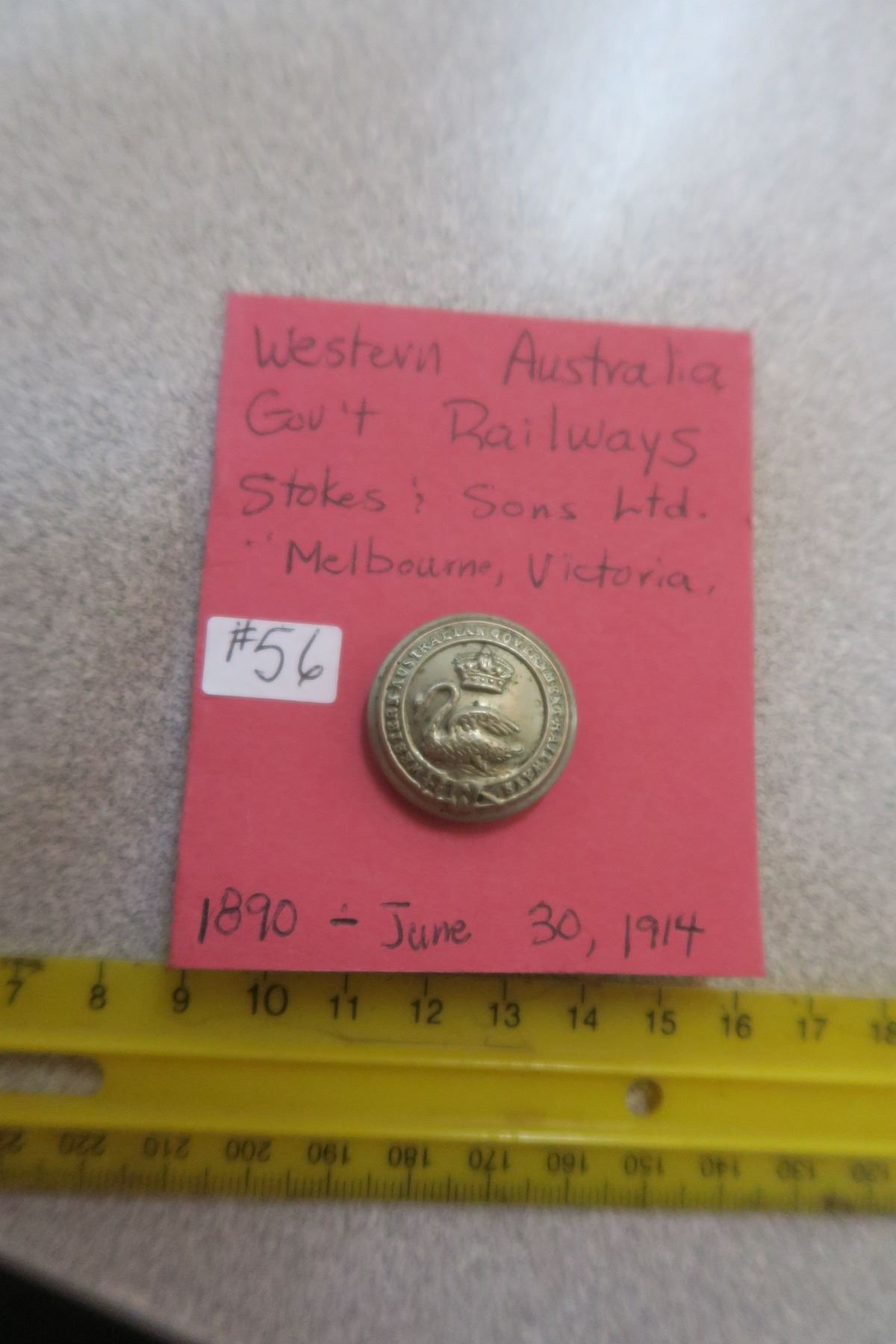 Western Australia Gov’t Railway uniform button, 1890 to June 30th, 1914