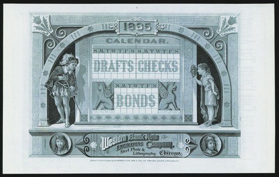 Chicago, Illinois, 1885, Multi-faceted design promoting calendars, drafts, checks and bonds, XF condition, WBNC.