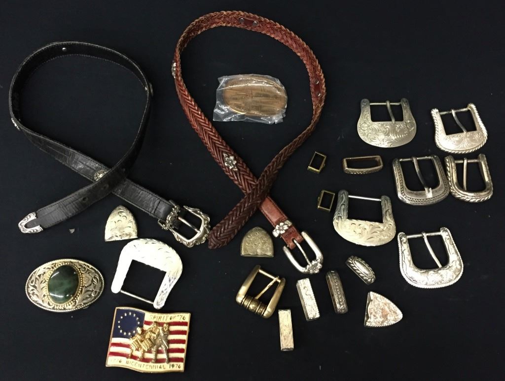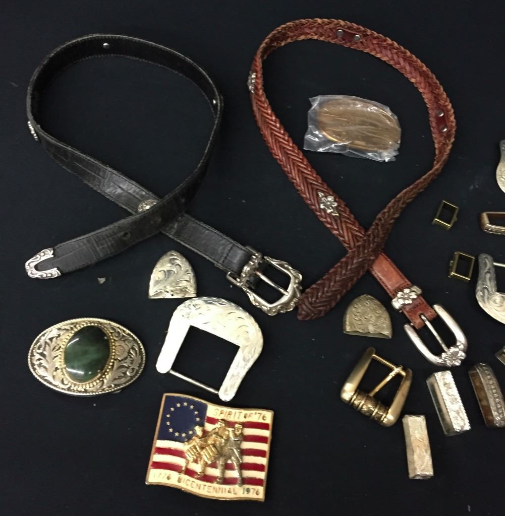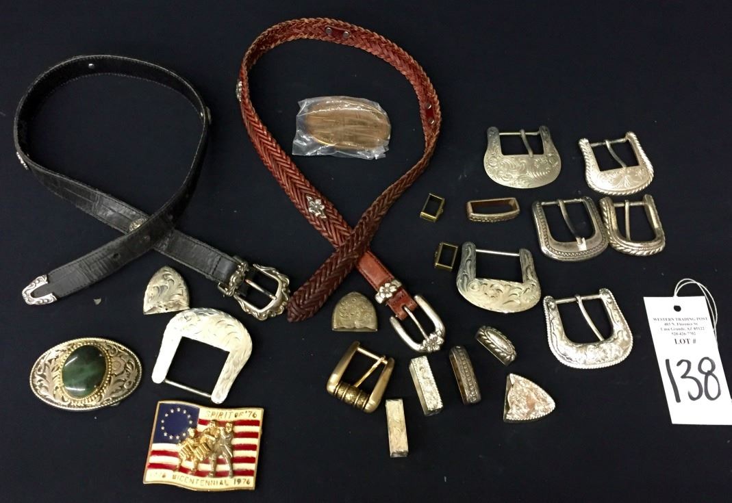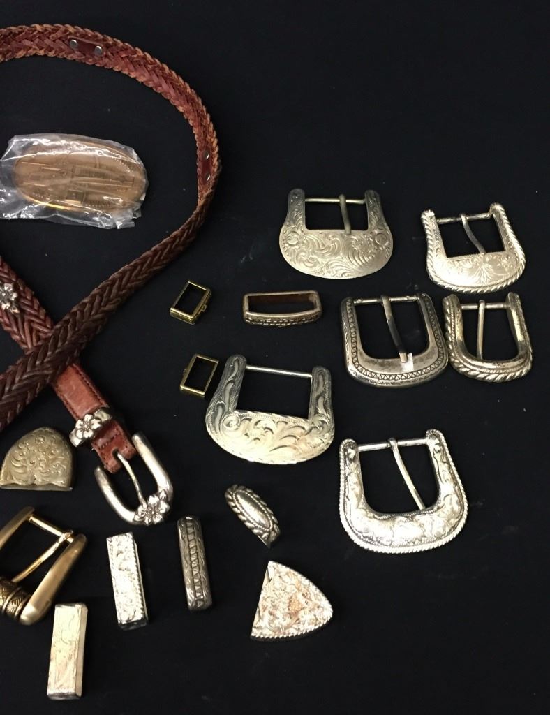 There are 8 different “ranger” style belt buckles, 3 different “western” style belt buckles and 2 complete leather belts included here! Numerous items including tips and keepers also! Please look closely at the pics as they are an important part of our description. Shipping: There will be a $7 handling / packaging fee for shipping this lot. The actual cost of postage will be added on top of that.