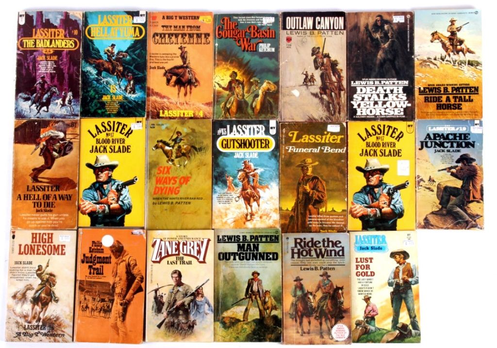 The lot features 20 Western paper back novels from such authors as: Jack Slade, Philip Ketchum, Lewis B. Patten, Zane Grey. The books all sell as one lot.