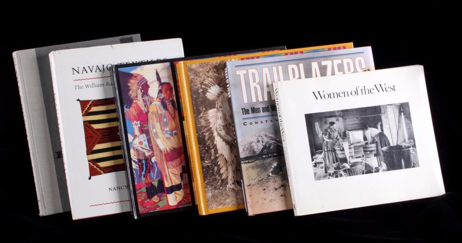 This is a collection of six Western books. Included is "Pikunni Portfolio Volume One", "Pikunni Portfolio Volume Three", "Navajo Textiles", "Women of the West", "The Frontier Years" and "Trailblazers". Each of the books is in good overall condition. The largest book measures 10.25" x 12.25".