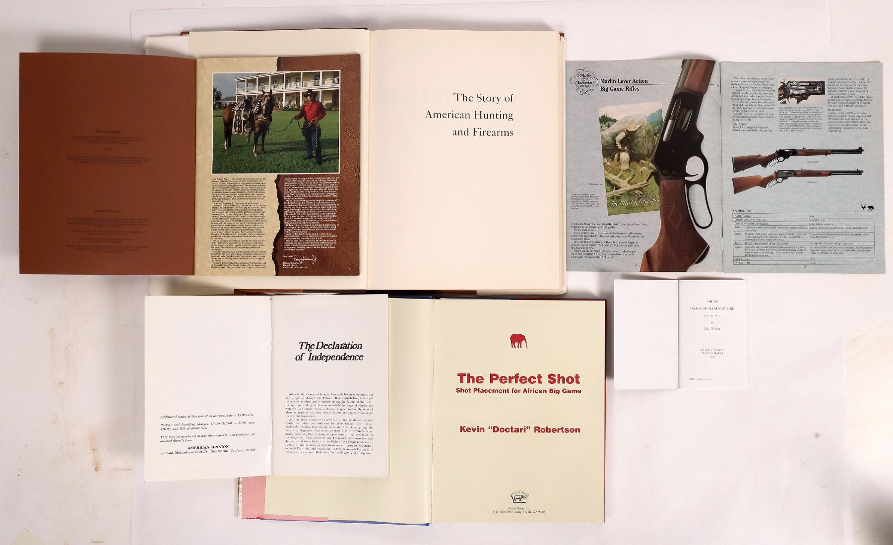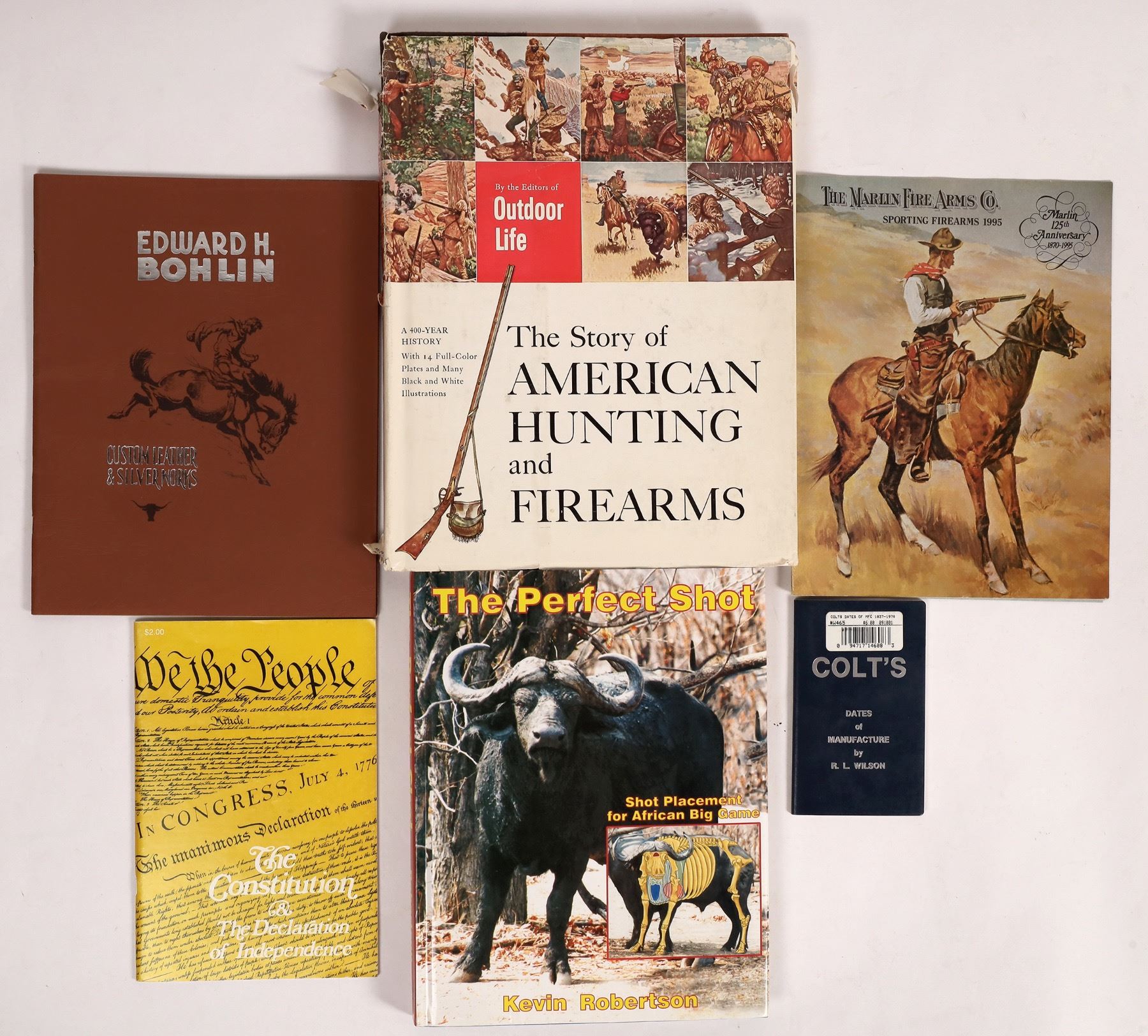Group of 6 books related to hunting, firearms, and other Western themes. Titles include The Perfect Shot: Shot Placement for African Big Game by Kevin Robertson, a Custom Leather & Silver Works catalog by Edward H. Bohlin, Colt's Dates of Manufacture by R.L. Wilson, a catalog from the Marlin Firearms Co., The Story of American Hunting and Firearms, and a copy of the Constitution and Declaration of Independence. Largest book is 10.25 x 13.25 inches.