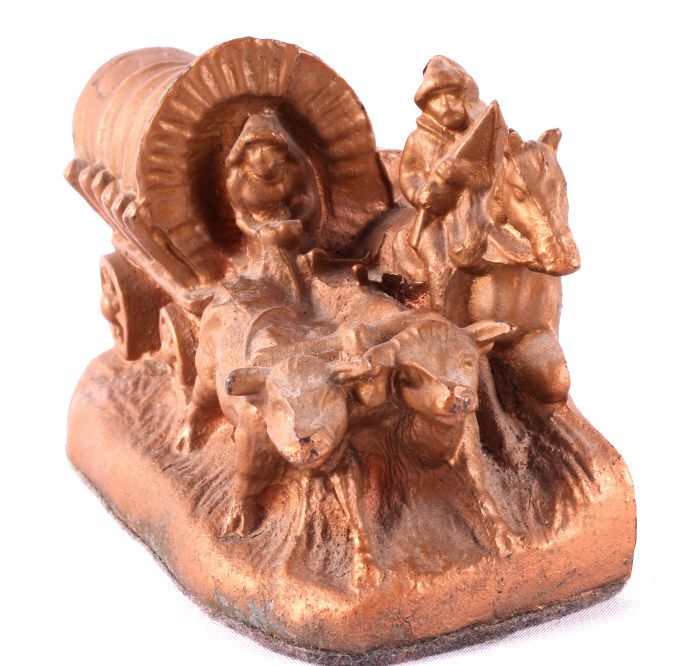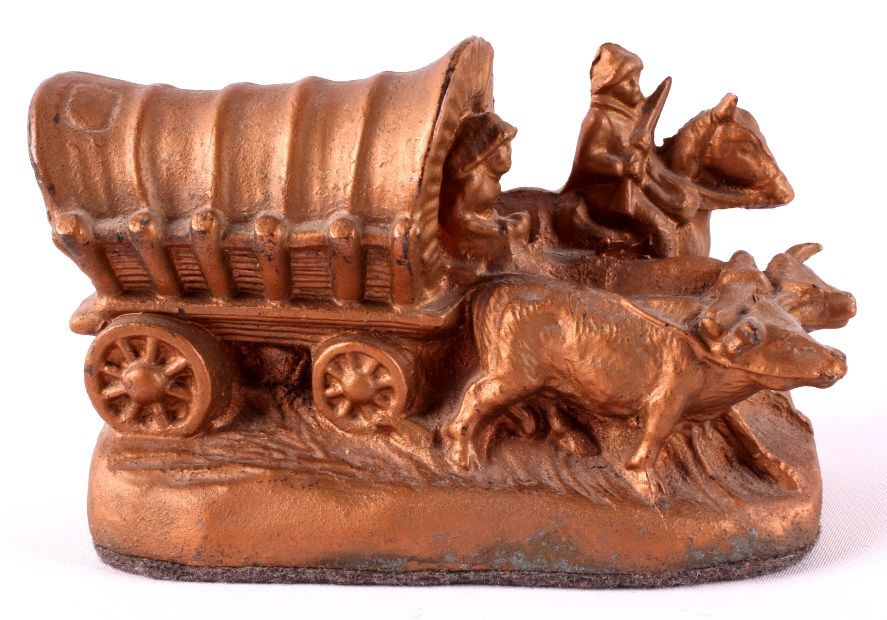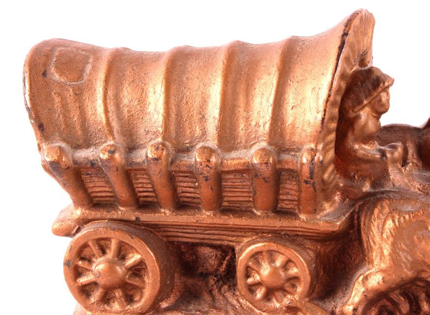 This lot includes 5 western bookends. There is a set of covered wagon and three horse bookends that match. The bookends show great detail and are in very good condition. The covered wagons measure 3" x 6.5" x 4".