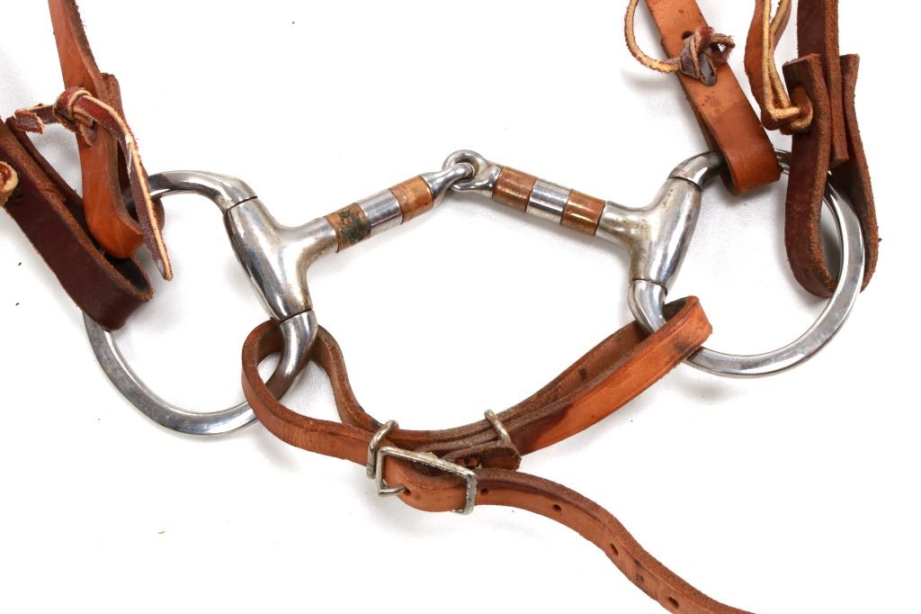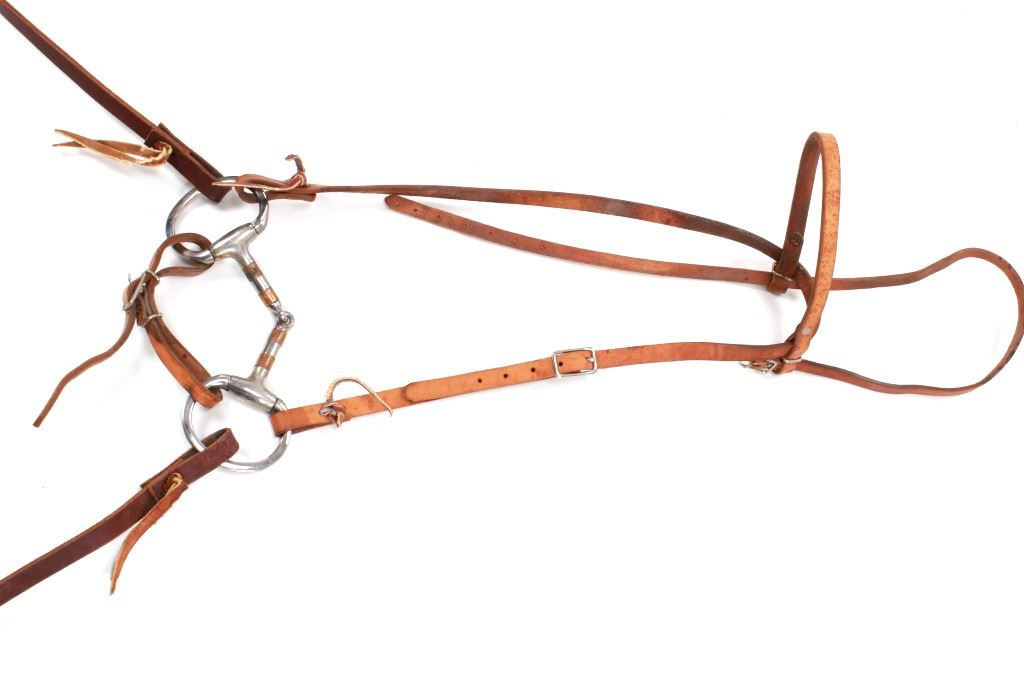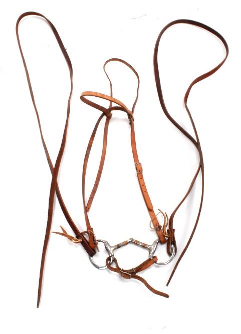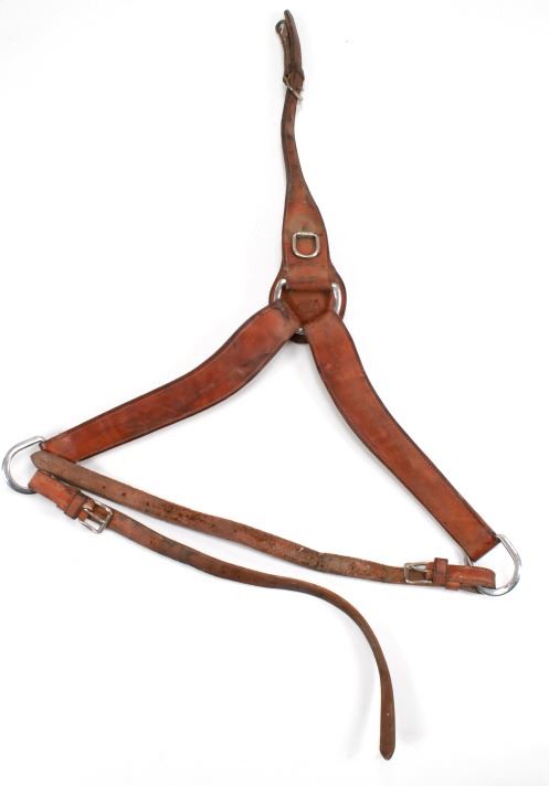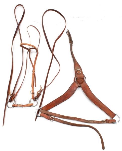 Featured in this lot is this western bridle headstall and breast collar collection. There are two pieces of tack in this collection. The first is a headstall with a D-ring snaffle bit attached. The second is a breast collar from Kings Saddlery out of Sheridan, Wyoming. The condition of this bridle and headstall is good, with wear consistent with use. The bridle headstall is full size, as is the breast collar.