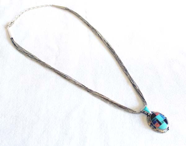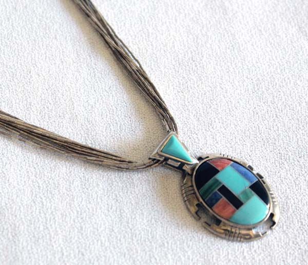 Western Carolyn Pollack Sterling Inlay Pendant, sterling silver 10 strand liquid sterling silver necklace, measures 24'' end to end with a mosaic channel inlay pendent set with turquoise, jet, coral, and malachite and measures 1.5'' x 1'', pendant has beautiful cutaway sides, stamped .925 and hallmarked