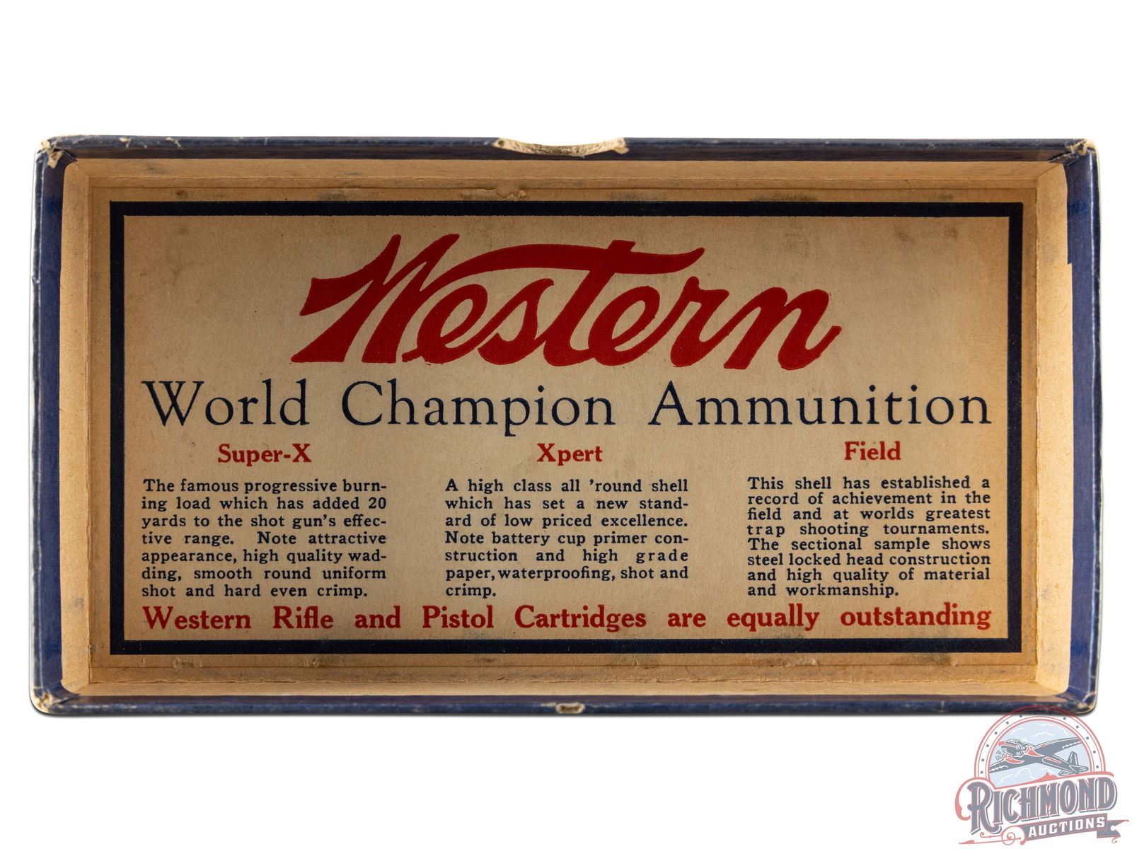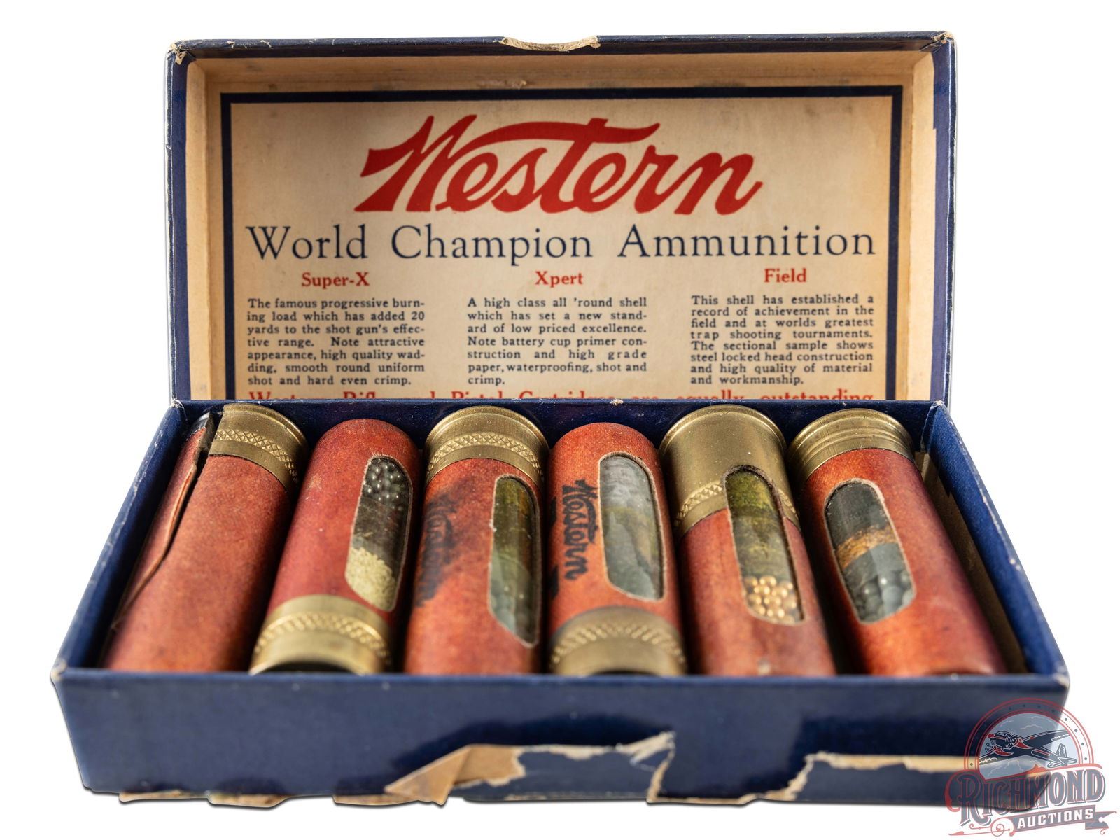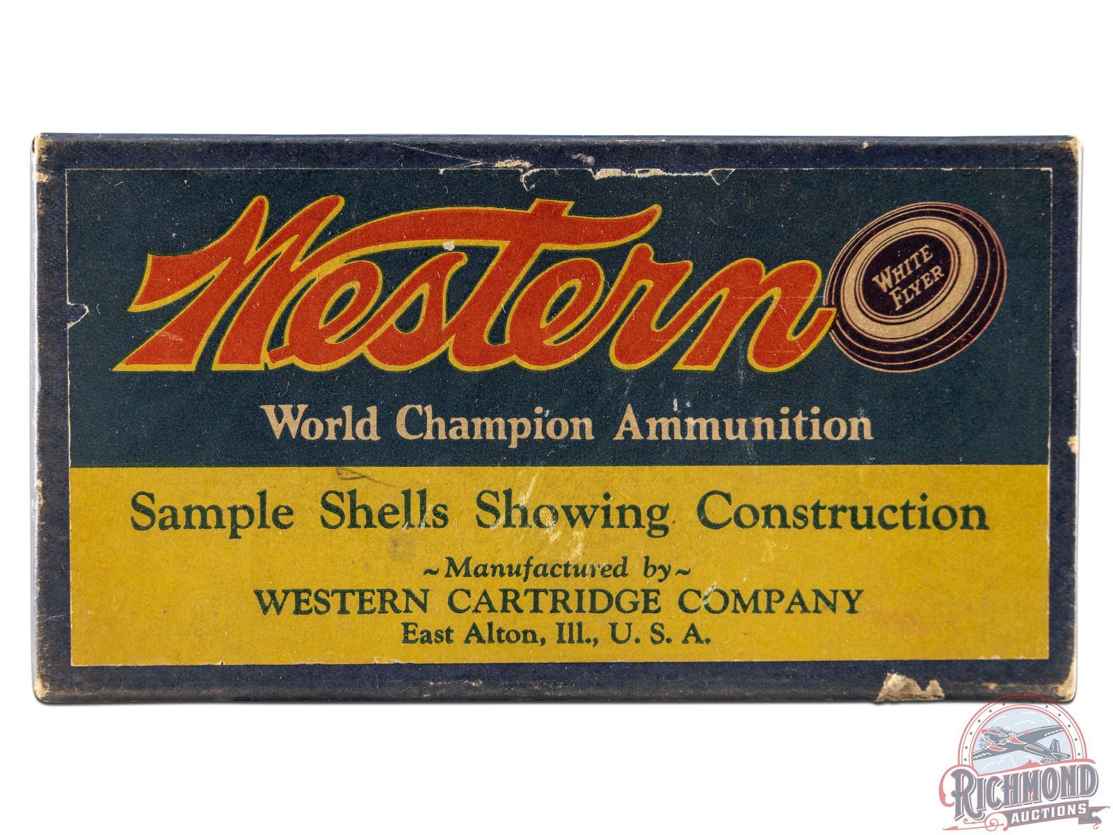 Western Cartridge Company Salesman Dummy Sample Kit with Western Super-X, X-pert, Record and Field brand shotgun shells. Housed in two-piece blue cardboard box with Western logo and a White Flyer clay pigeon with kit demonstrating shell construction.