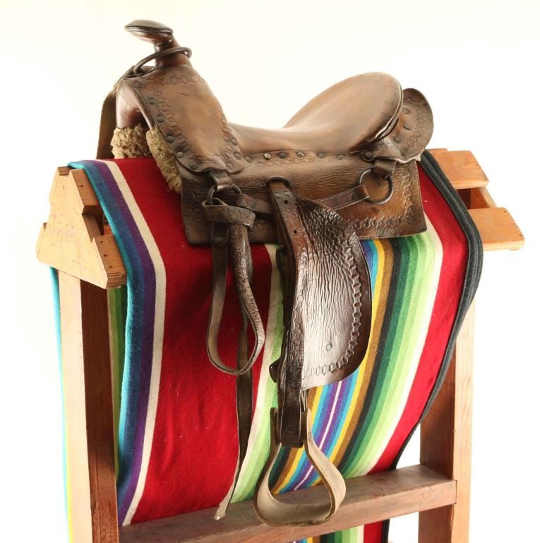 Brown tooled leather with wood stirrups. 10 1/2" seat on 30" h x 18"w x 24"d wooden stand with striped Pendleton Beaver State blanket.