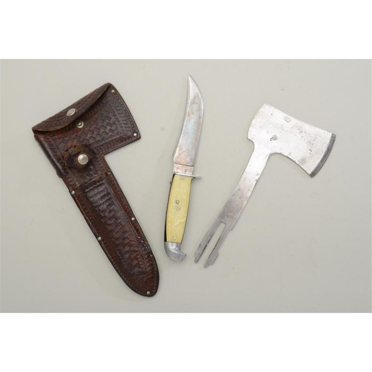 Western Co. combination knife and hand axe in tooled leather sheath with interchangeable blade and axe head, approx. 10” overall and in very good condition; the sheath is also in overall very good condition; grip permitsthe removal of one attachment and addition of the other via a spring retainer. Western Co. was in Boulder, Colorado; this set appears to be circa 1930’s/1940’s. Est.: $125-$250.