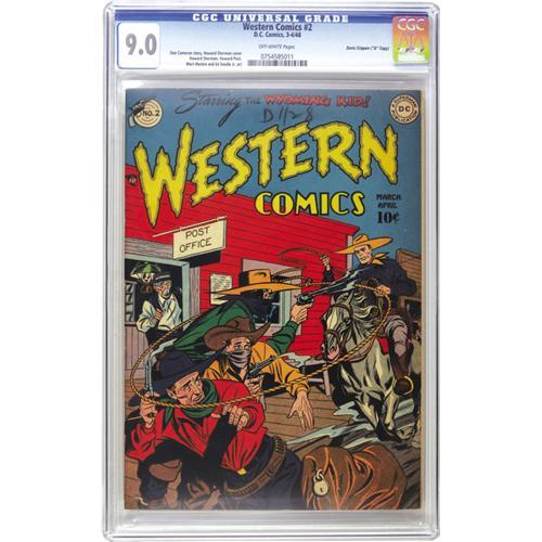 <B>Western Comics #2 Davis Crippen ("D" Copy) pedigree (DC, 1948) CGC VF/NM 9.0 Off-white pages.</B></I> This title paired the Wyoming Kid, who had debuted in the previous issue, with the Vigilante, seen previously in <B>Action Comics</B></I>, and threw in a couple of other cowpokes for good measure. The book's artists include Mort Meskin (the Vigilante) and Howie Post (Rodeo Rick). The cover is credited to Howard Sherman. Overstreet 2006 VF/NM 9.0 value = $348; NM- 9.2 value = $465. CGC census 10/06: 1 in 9.0, 2 higher. <I>From the Crippen Collection.</B></I><BR><BR><b>Shipping:</b> Slabbed Comic (<a target="_blank" href="http://www.heritageauctions.com/common/shipping.php">view shipping information</a>)