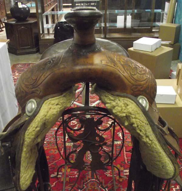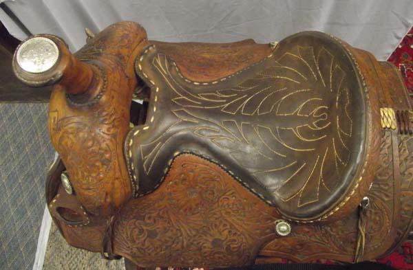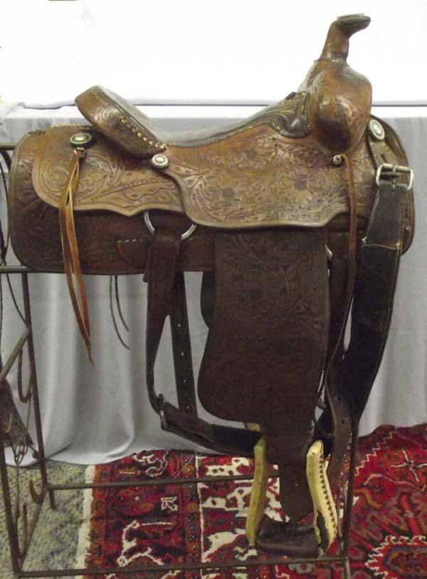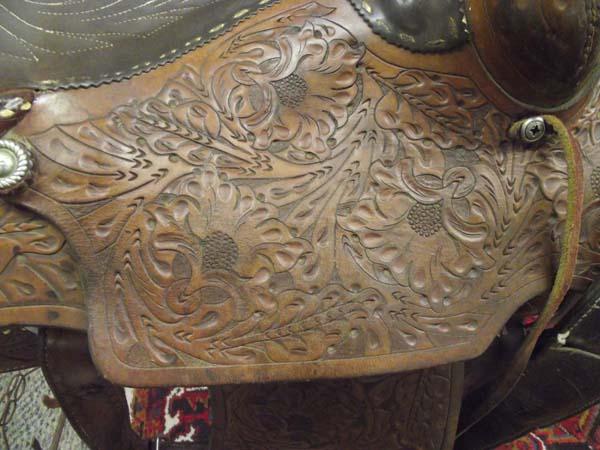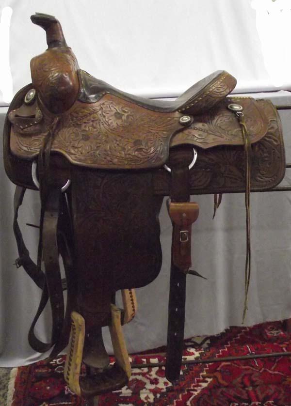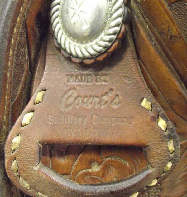 Western Court's Roping saddle. Fully tooled . 16''. Cinch and rear cinch. Sterling medallions decorate. Court's Saddlery Company, Texas. Buyers Pay Actual Shipping and Handling Charges(see terms and conditions for more information).