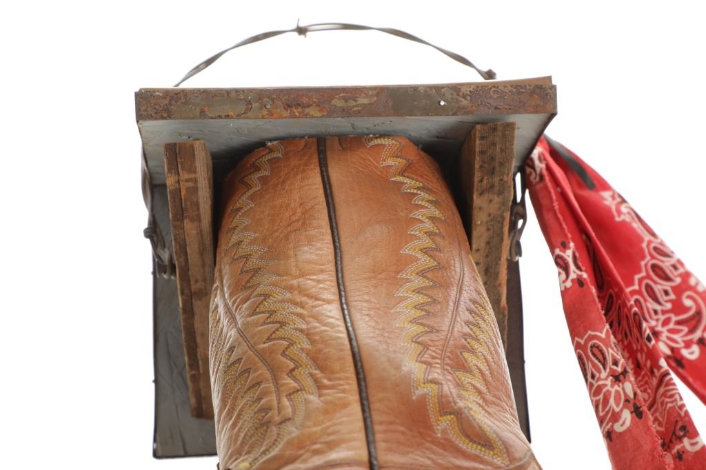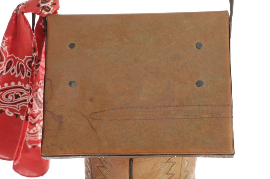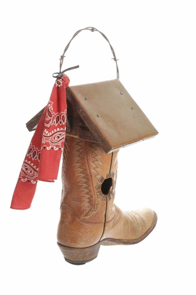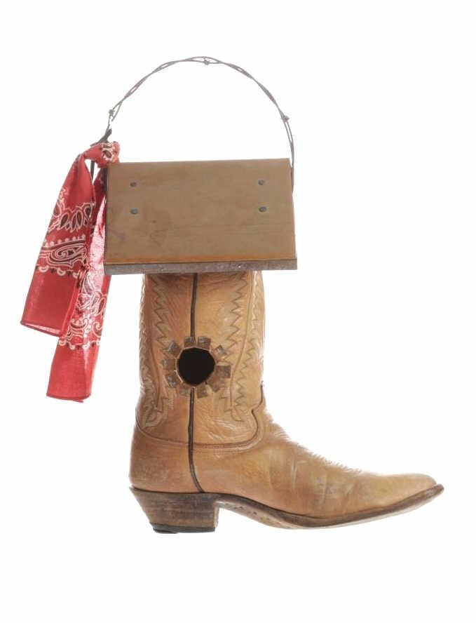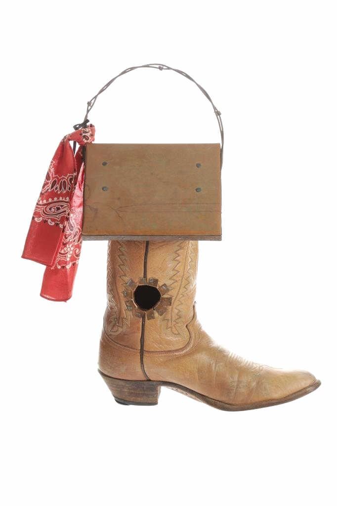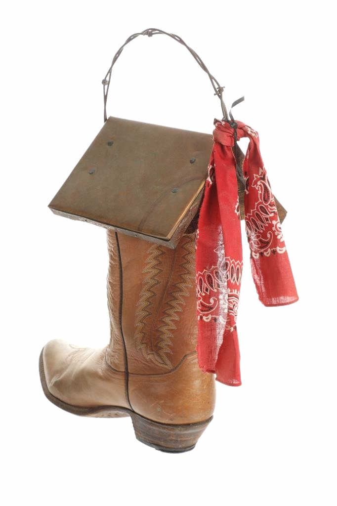 Featured in this lot is this western cowboy boot rustic tin bird house. The bird house features a western cowboy boot with a tin infrastructure and a tin wrapped wooden roof that features a barbed wire hand and a red bandana strip tied to the handle. The condition of this bird house is good with some wear from age to the boot but otherwise in good overall condition. The measurements of this bird house are 18" x 7" x 11 1/2".