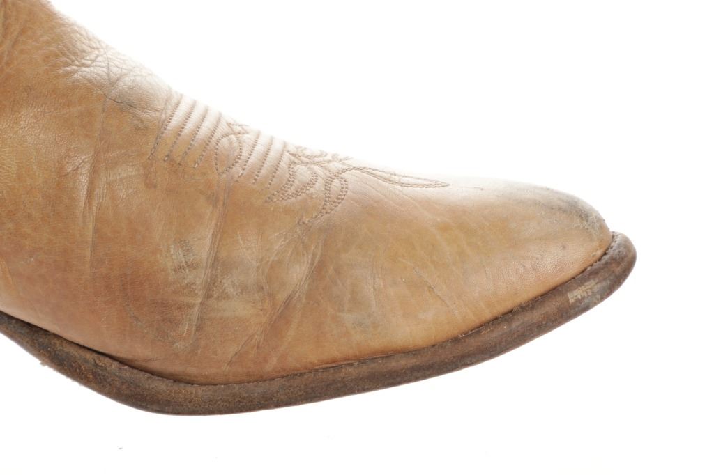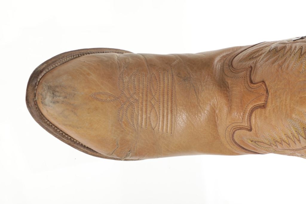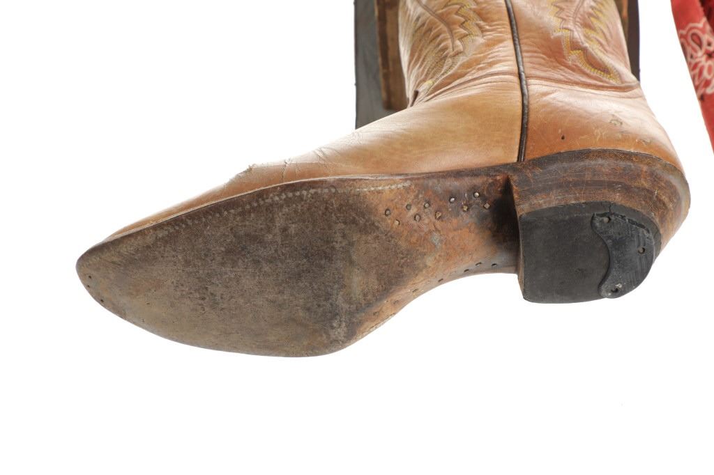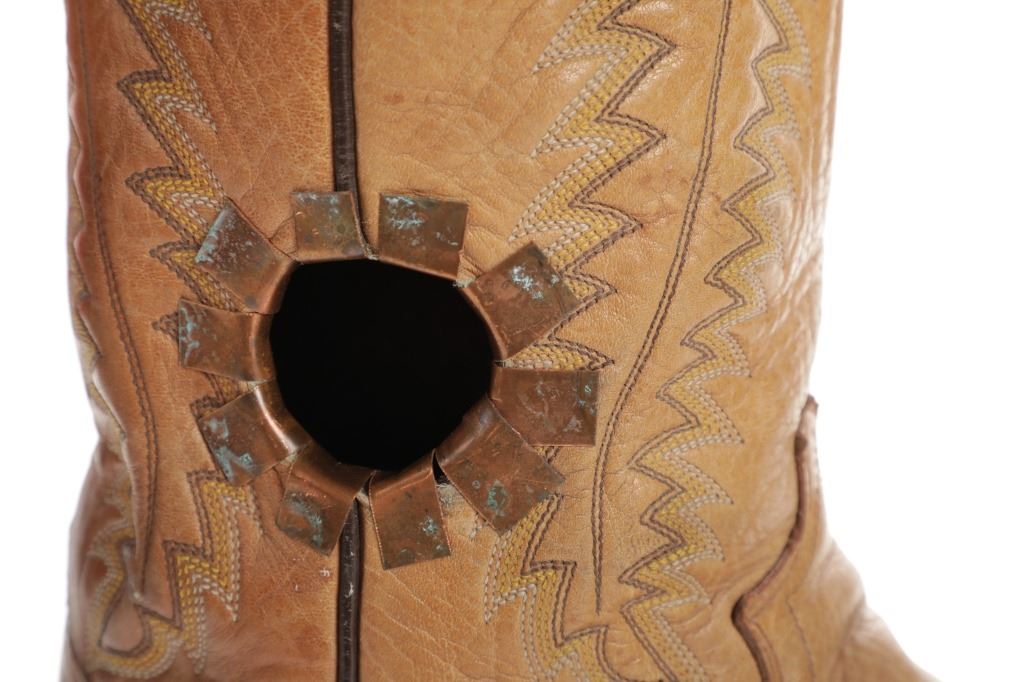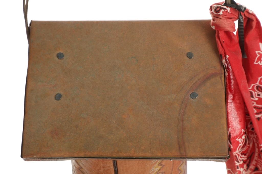 Featured in this lot is this western cowboy boot rustic tin bird house. The bird house features a western cowboy boot with a tin infrastructure and a tin wrapped wooden roof that features a barbed wire hand and a red bandana strip tied to the handle. The condition of this bird house is good with some wear from age to the boot but otherwise in good overall condition. The measurements of this bird house are 18" x 7" x 11 1/2".
