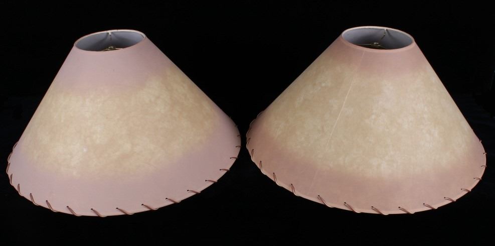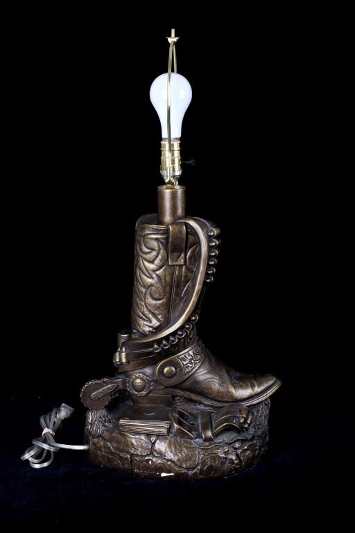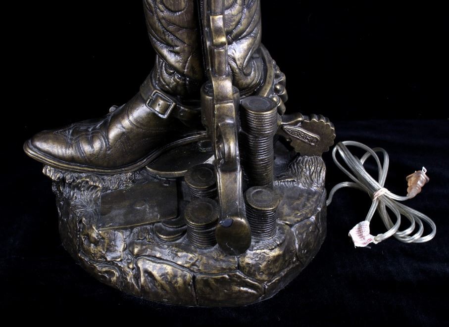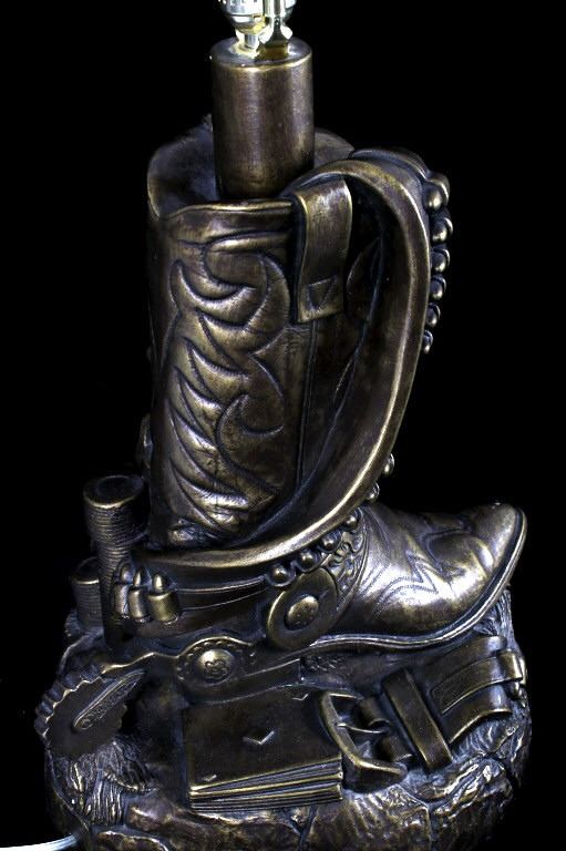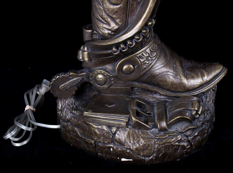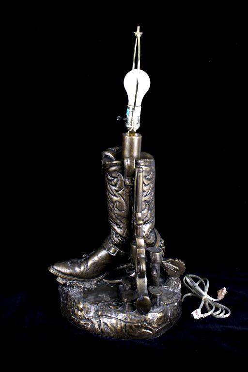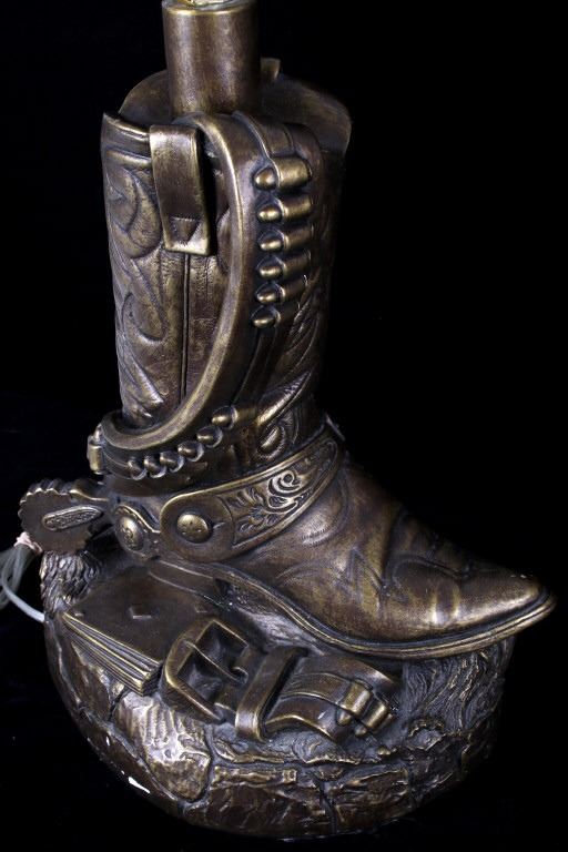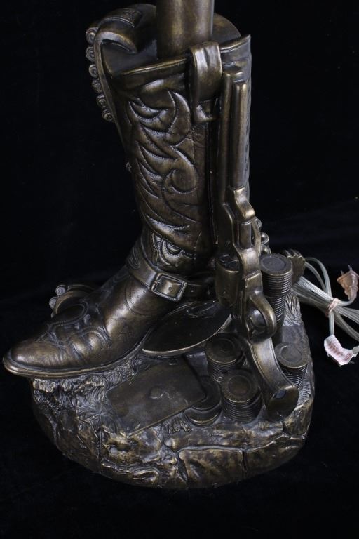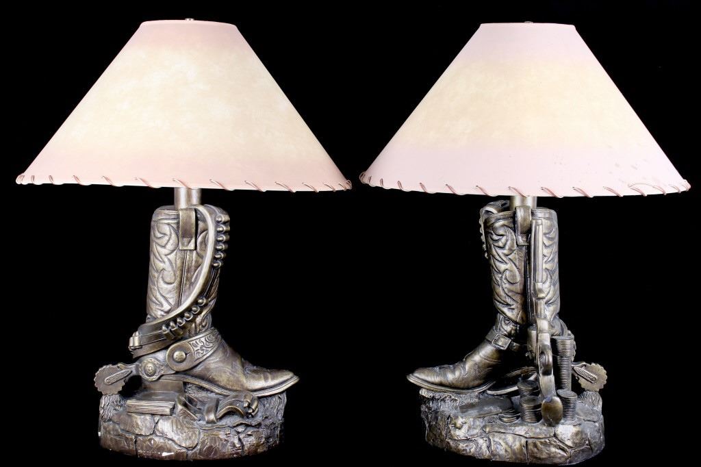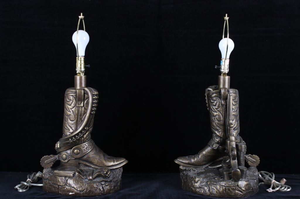 Available for your bidding pleasure is a pair of western cowboy boot and gun belt table lamps. Each lamp shows a boot draped with a gun belt and an early model Colt pistol with playing cards and poker chips. They are cast with a bronze style finish. The lamp shades are made to resemble suede leather. The lamps are in very good condition. They measure 10.5" x 13.5" and are 28" tall. The shades are 21.75" in diameter. One of the lamps shows some repairs and chips.