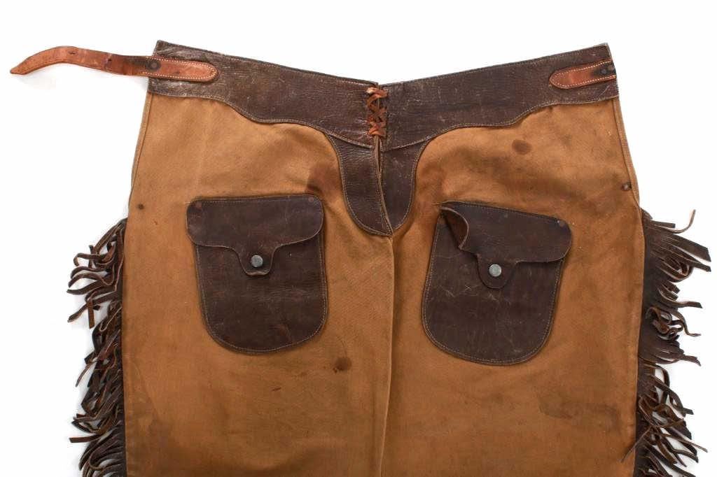 Featured in this lot is this pair western cowboy canvas shot gun chaps circa 1940's. This pair of chaps features a canvas construction with leather pockets and the frame of the chaps constructed from harness leather. The condition of this pair of chaps is fair with a small amount of damage to the male end of the belt but otherwise in good overall condition. The overall measurements are