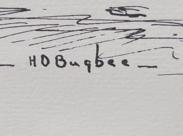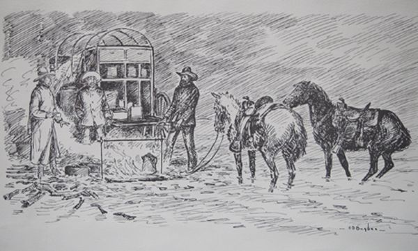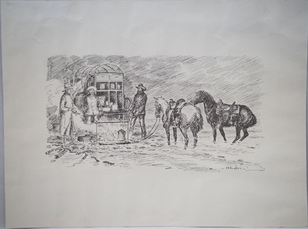Western Cowboy Chuckwagon Print by H. D. Bugbee (1900-1963), measures 20'' x 15'', signed in lower right corner H D Bugbee Artist Bio: Though he spent his childhood in Lexington, Massachusetts, Harold D. Bugbee (1900-1963) came of age in the Texas Panhandle after his family moved to Clarendon in 1914. There, they joined a cousin-the cattleman T.S. Bugbee-on his ranch outside town. A budding artist, Bugbee began sketching life on the ranch and soon that childhood talent blossomed into a career. He spent summers at the Taos Art Colony and, in 1921, graduated from the four-year Cumming School of Art in Des Moines, Iowa, after only two years as a student there. During the 1920s, Bugbee exhibited in galleries in Denver, Chicago, Kansas City and New York, but turned to magazine work when sales declined during the Great Depression. It was during this period that his illustrations began to appear in publications like Western Stories, Country Gentleman and Field and Stream-as well as Western history books including Charles Goodnight: Cowman and Plainsman, by J. Evetts Haley. In 1951, Bugbee became curator of art at PPHM. He contributed five murals in Pioneer Hall and eventually gave 200 of his works to our permanent collection.