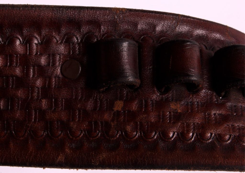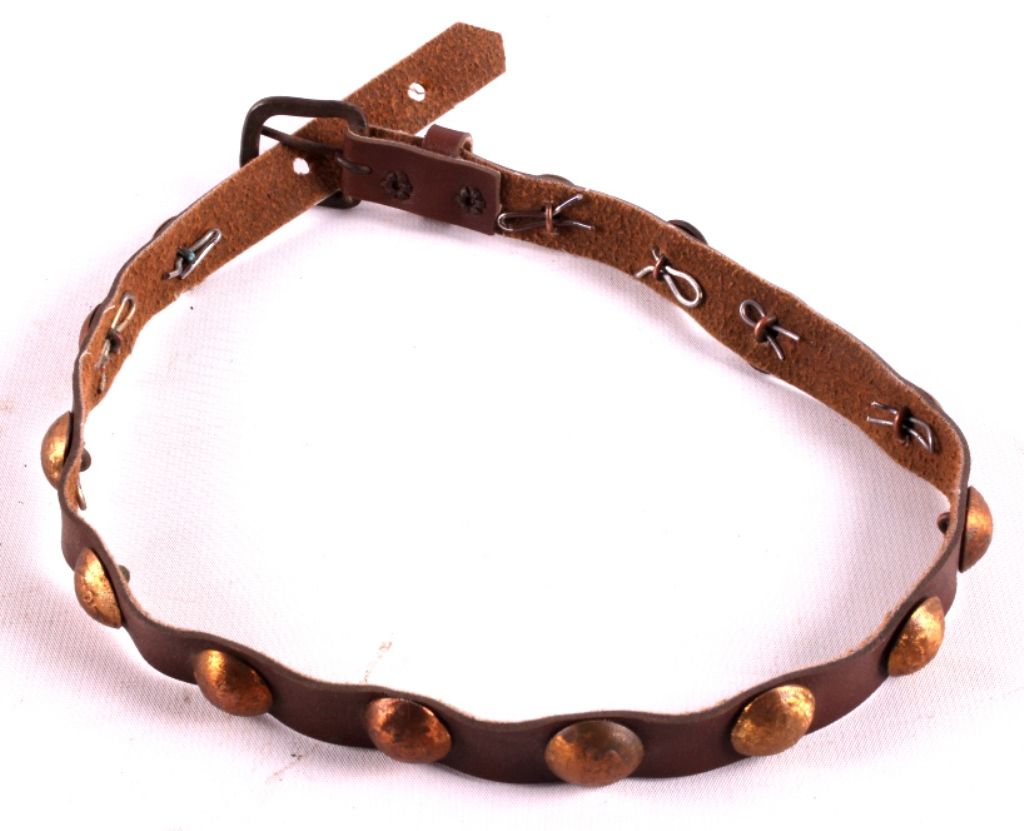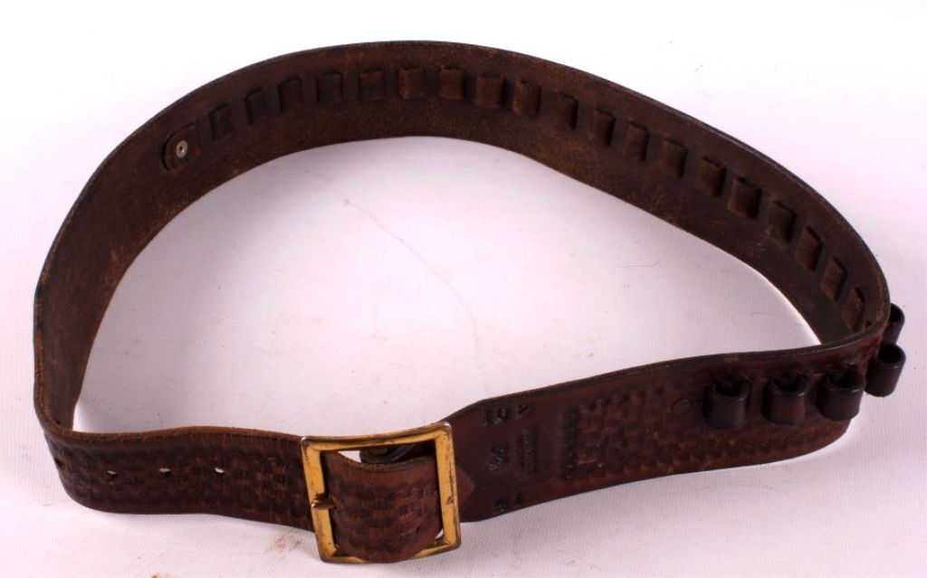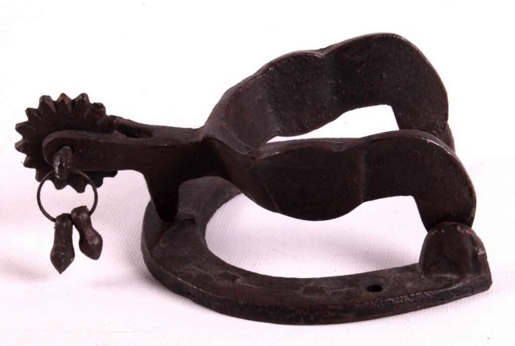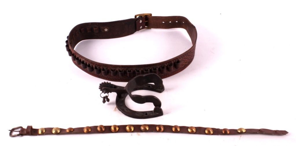 This is a Western cowboy collection that includes a leather holster belt, a cast iron door knocker, and a hand made coin belt. The leather holster belt is marked "Idaho Leather Co. Boise Idaho". It is in very good condition and measures 39" long. The cast iron door knocker is made from a spur and horseshoe. The coin belt is made from leather. It is studded with hand made buttons that were made from Mexican coins. It measures 25" long. All three pieces are in good condition.
