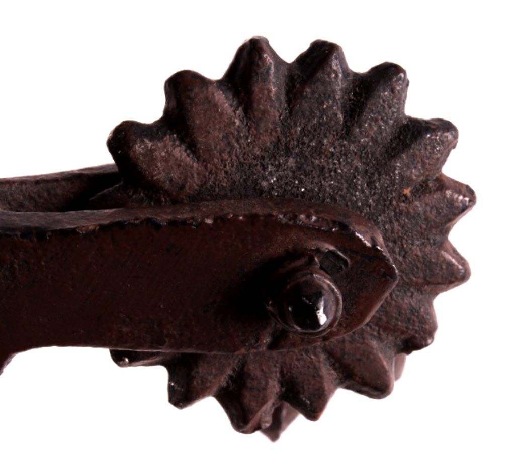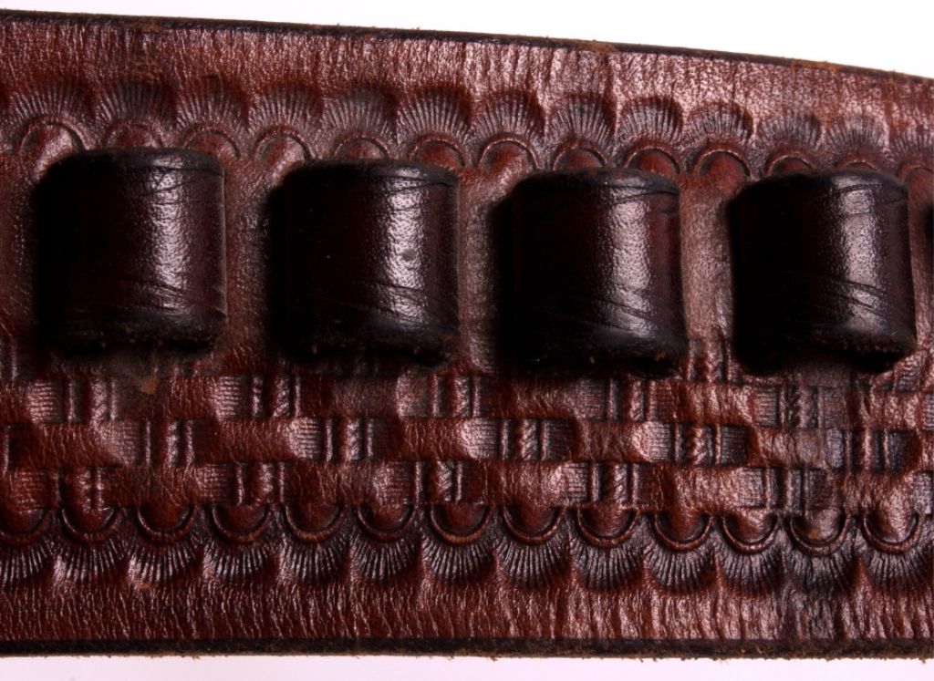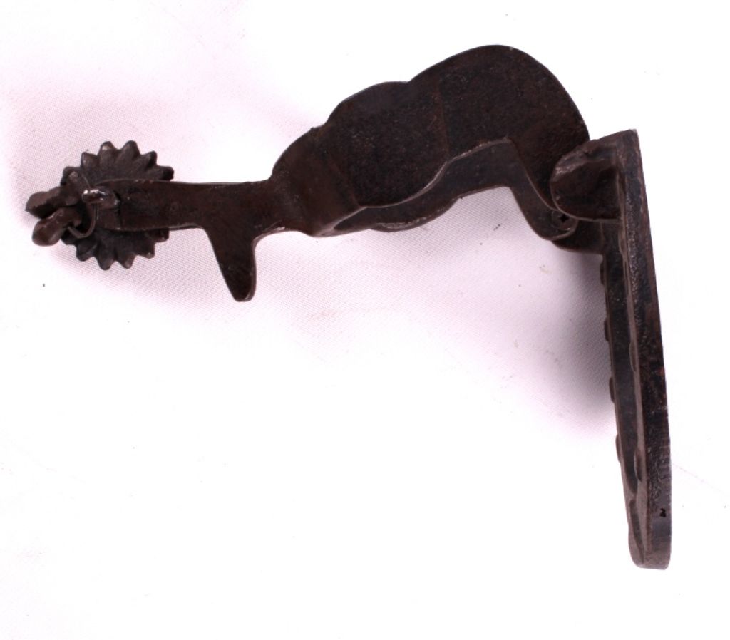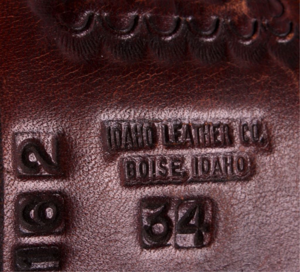 This is a Western cowboy collection that includes a leather holster belt, a cast iron door knocker, and a hand made coin belt. The leather holster belt is marked "Idaho Leather Co. Boise Idaho". It is in very good condition and measures 39" long. The cast iron door knocker is made from a spur and horseshoe. The coin belt is made from leather. It is studded with hand made buttons that were made from Mexican coins. It measures 25" long. All three pieces are in good condition.
