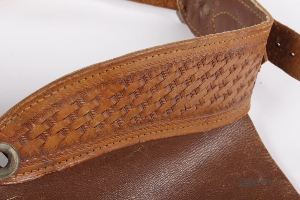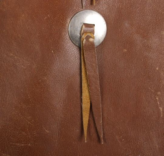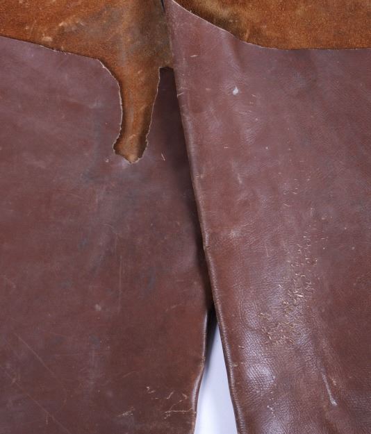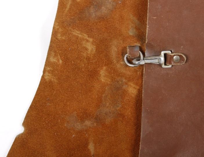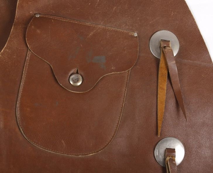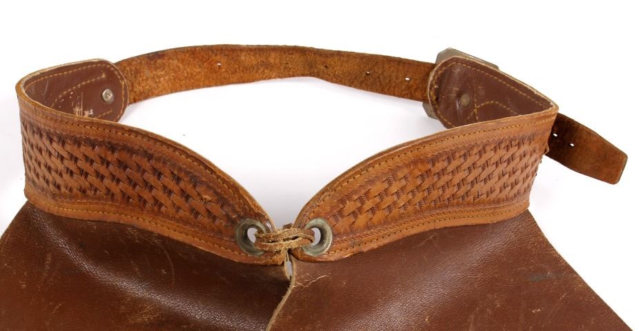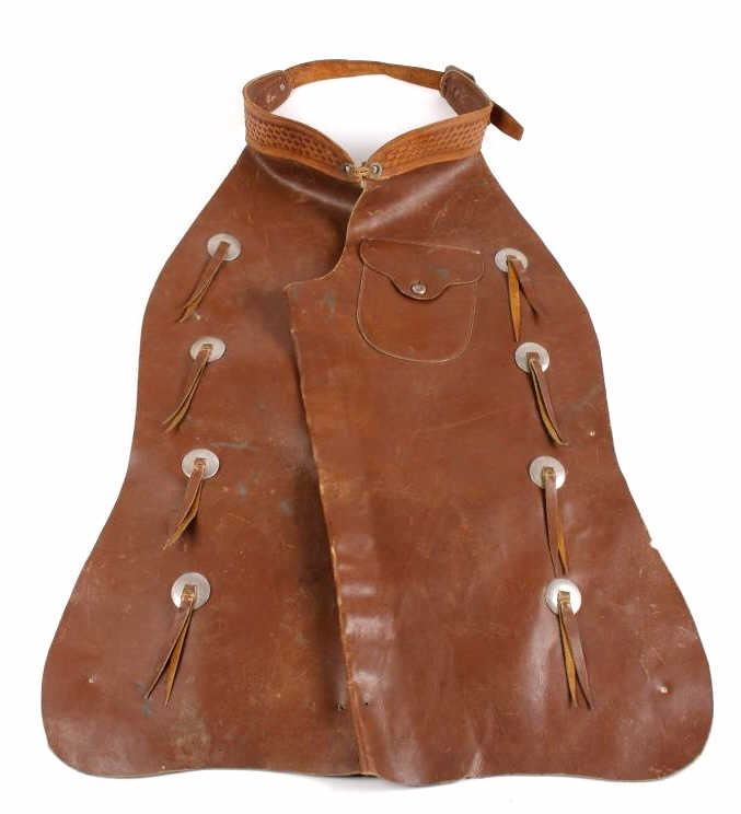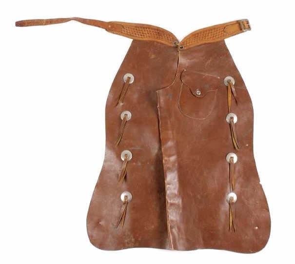 Offered in this lot for bidding is a pair of Western cowboy leather batwing chaps. The chaps offer full coverage protection, with an open leg design near the bottom. The back of each chap includes four hook, and loop closures, when worn on the leg, they have a dramatic flap near the boot. Additionally, each chap shows four silver colored conchos, with leather tassel drops, and a basket weave texture belt strap. The chaps are in good condition - however, displaying wear from use, and age. Each chap measures approximately 16" wide, and 36 3/4" long.