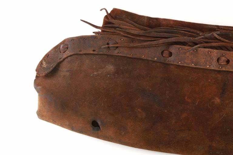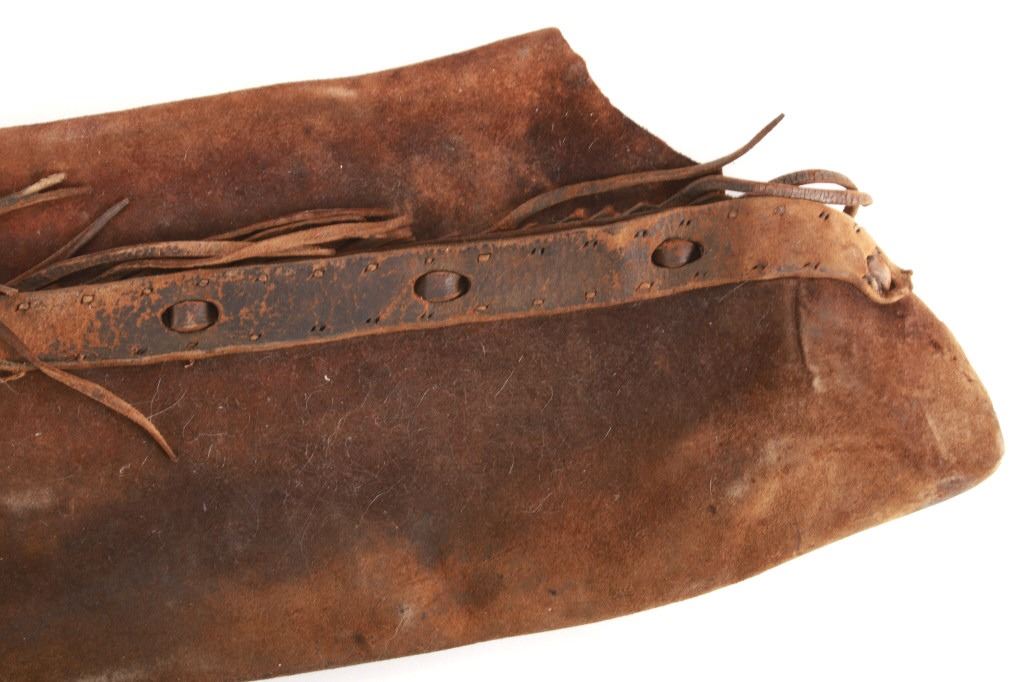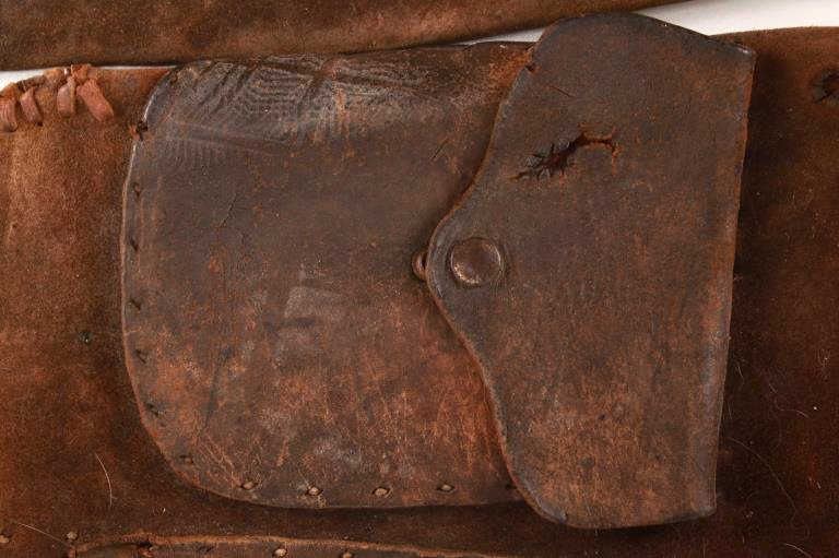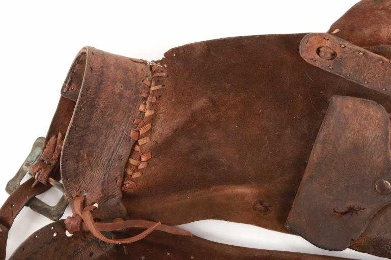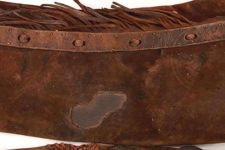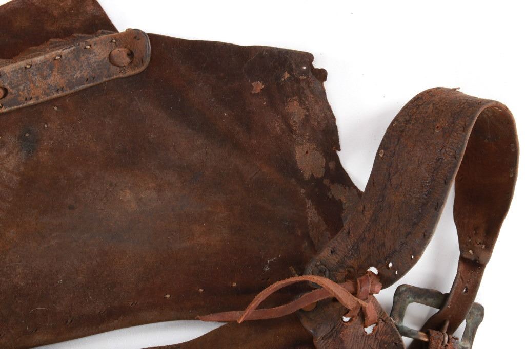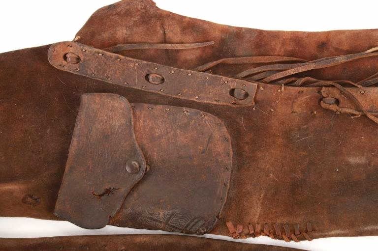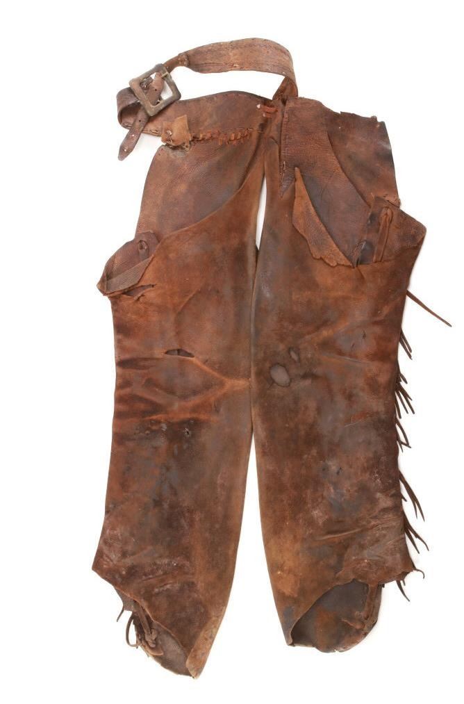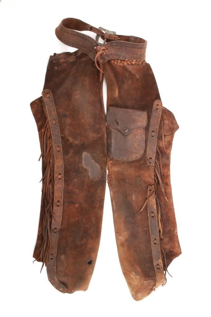 Featured in this lot is this pair of western cowboy shot gun chaps circa 1940's. This pair of chaps features wonderfully and professionally crafted leather construction with leather pockets and shows a fringe on both legs of the pair of chaps. The condition of this pair of chaps is fair with damage to the leather frame of the chaps and wear consistent with the age of the chaps. The measurements of this pair of chaps is 42" x 22".