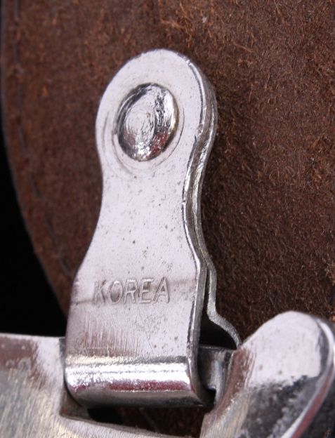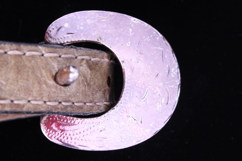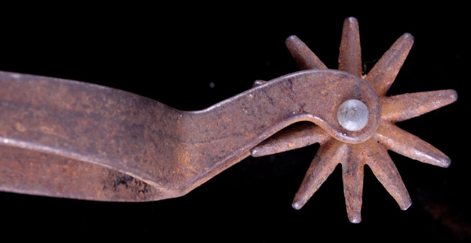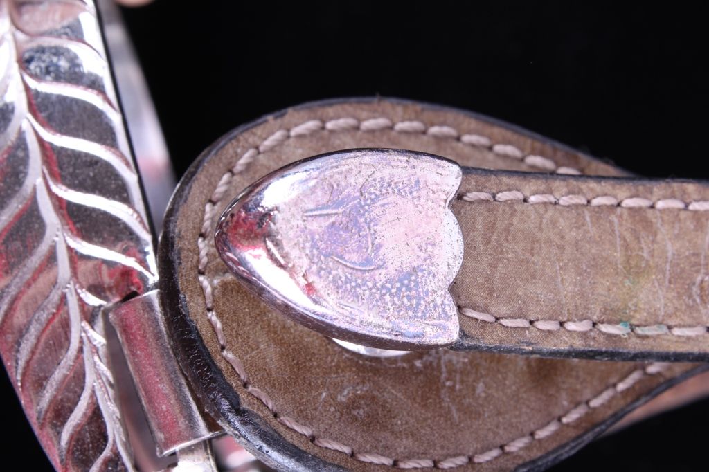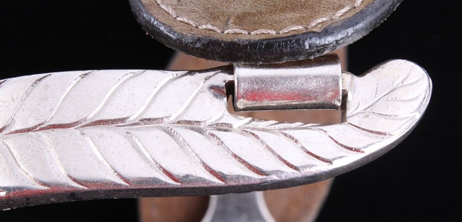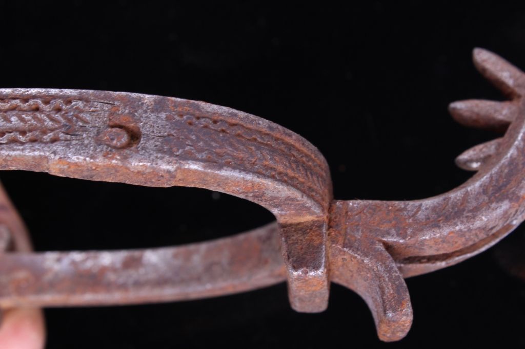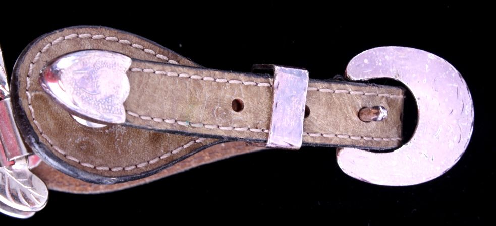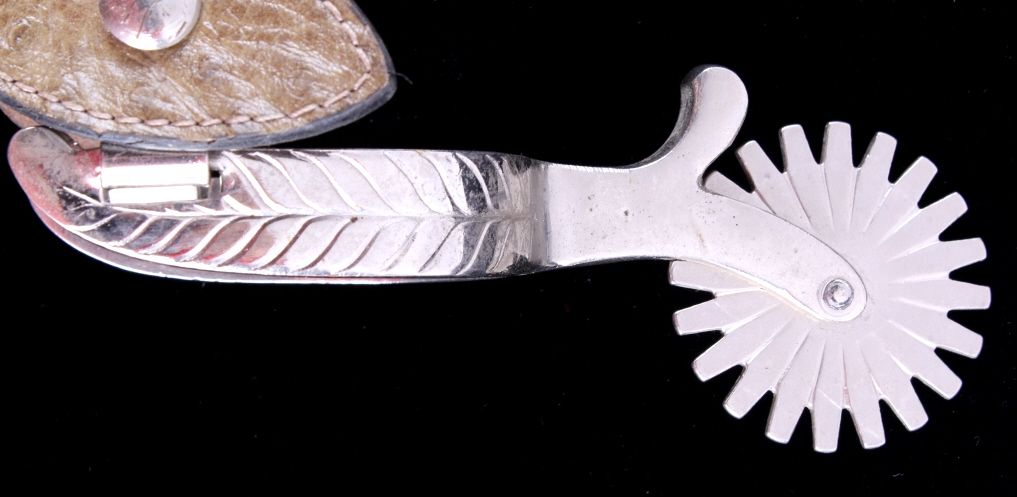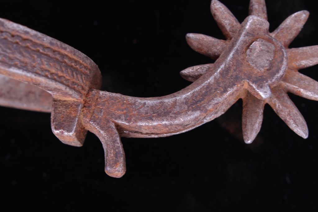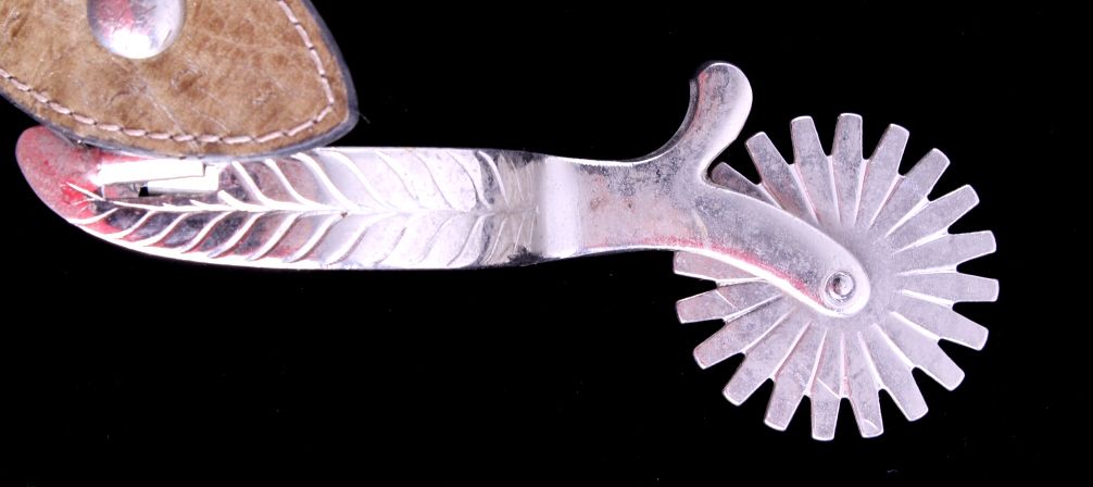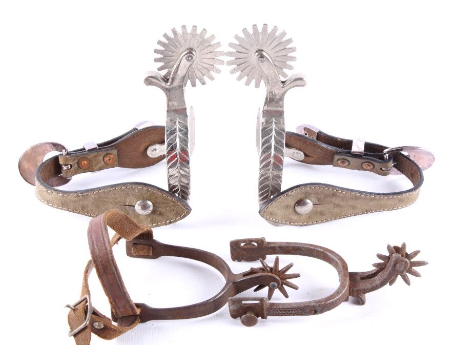 The lot features four spurs, a set of two stainless spurs and two cast/forged single spurs. The stainless spurs show a large rowel with a leaf like design across the arm and leather spur straps with silver plate etched designs. The other singles are antique spurs. Larger spur measures 6.5"x3 5/8" with 2 1/8" rowels. Korea.