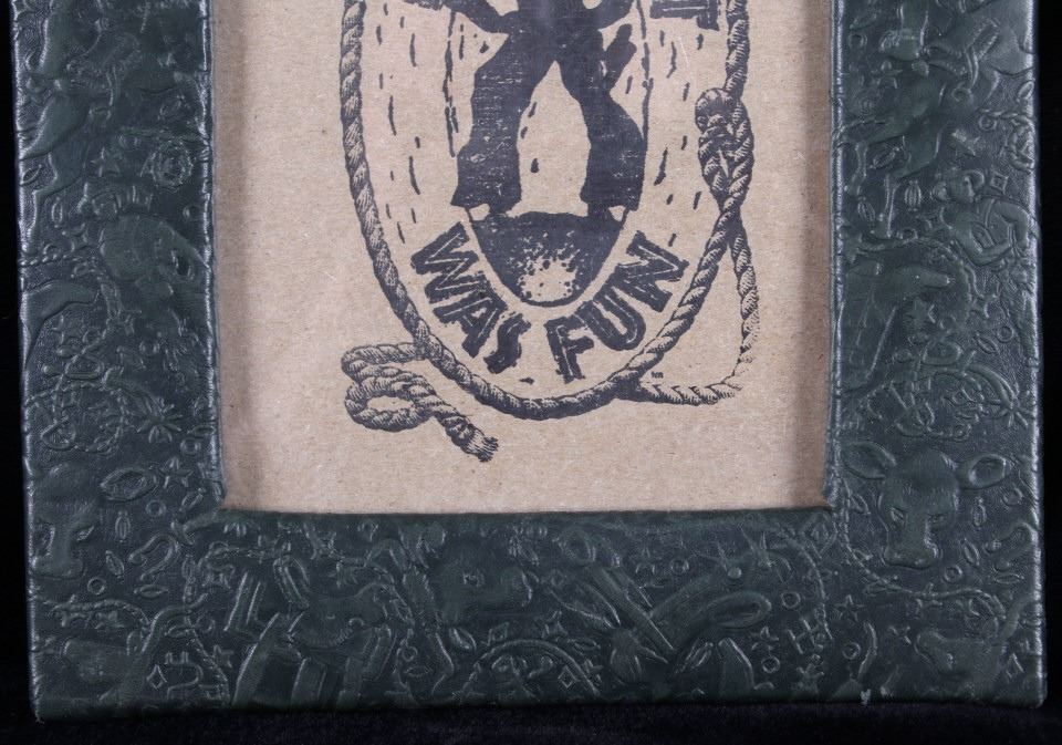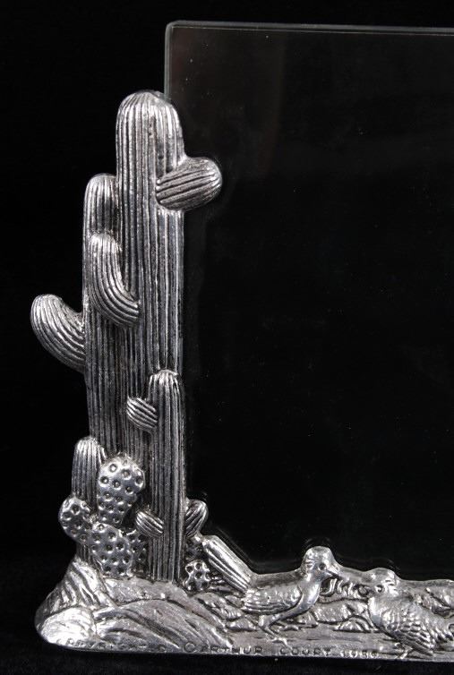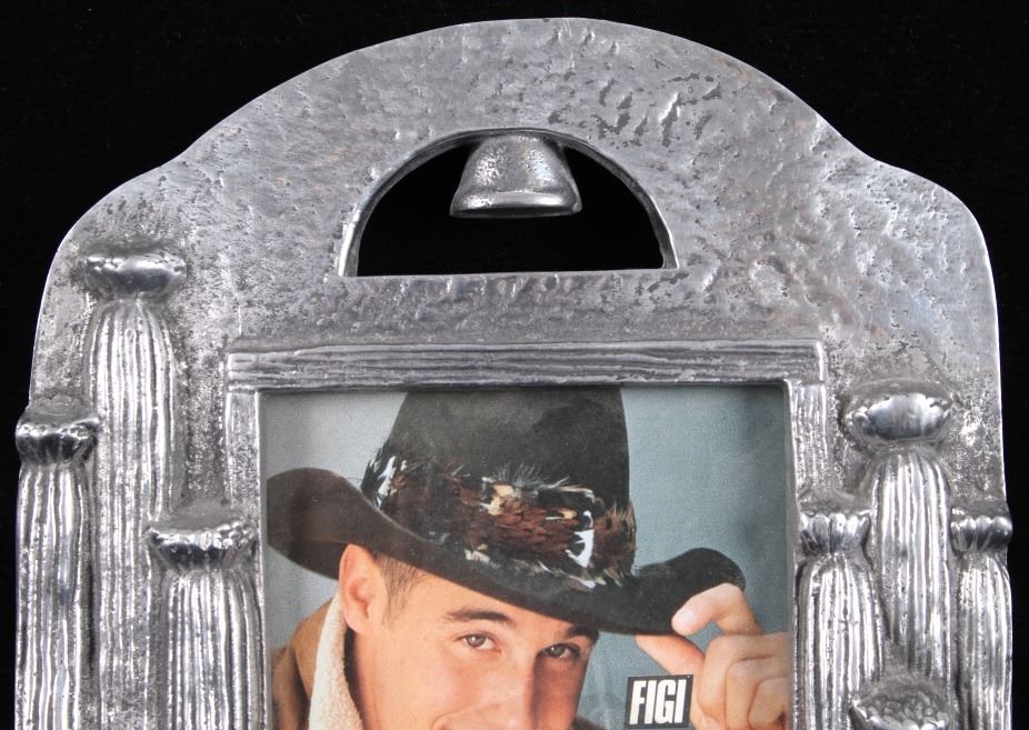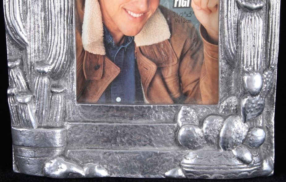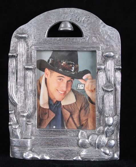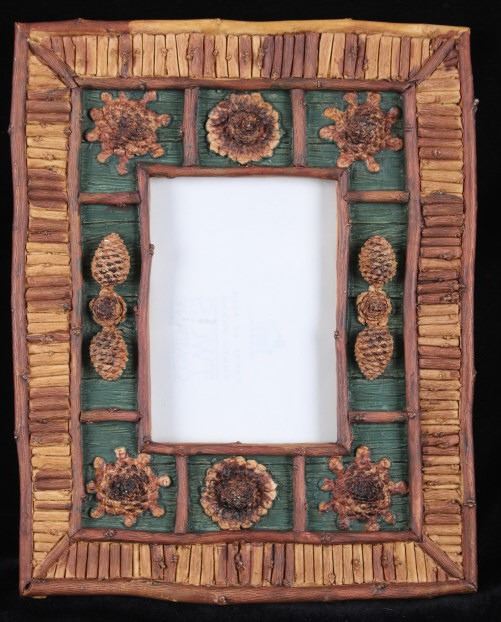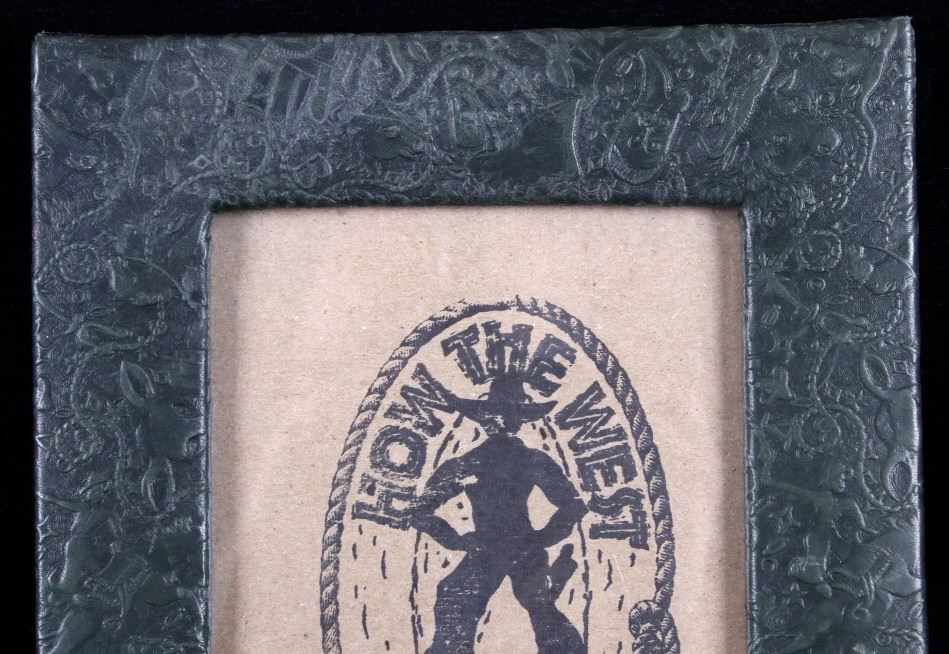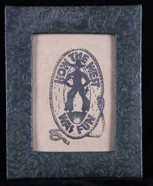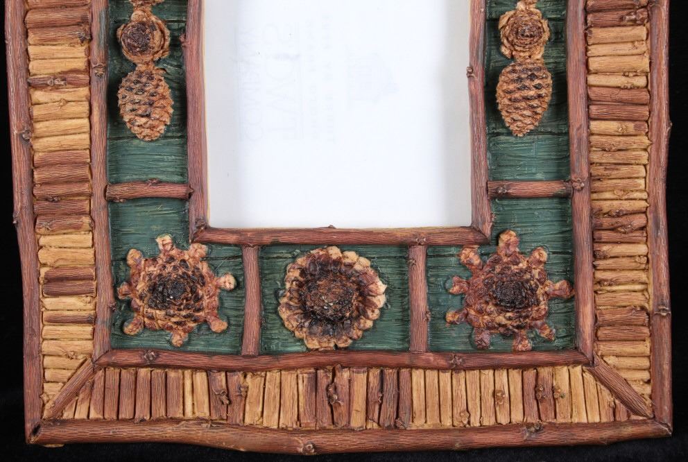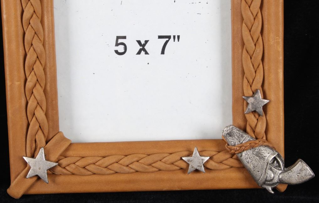 Featured in this lot is this western cowboy themed picture frame collection. There are three picture frames in this collection. The first is a rustic theme picture frame with ceramic wood decoration that shows acorns around the border. The second is is a stamped green leather wrapped frame with a western cowboy theme to the decoration. The last is a leather wrapped with western theme accoutrements of a western boot and a pistol in a holster. The condition of this collection of frames is good with no obvious signs of damage and in good overall condition. The measurements of these frames are 8 7/8" x 7 5/8" x 1 1/2" and 9 3/4" x 7 3/4" x 5/8"  and lastly 9 1/2" x 7 3/4" x 3/4".