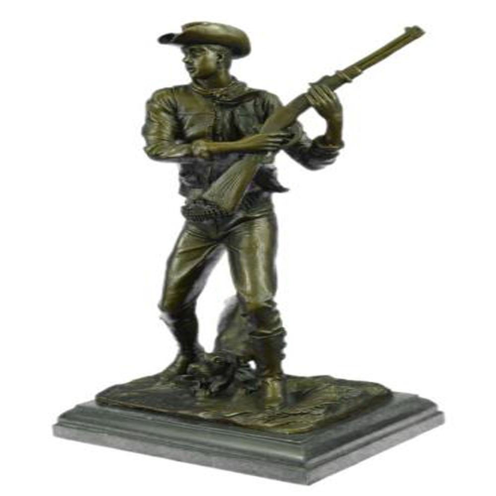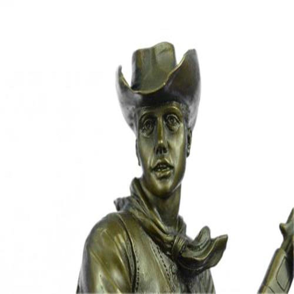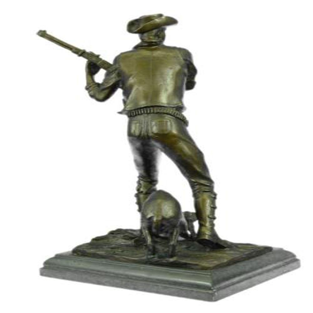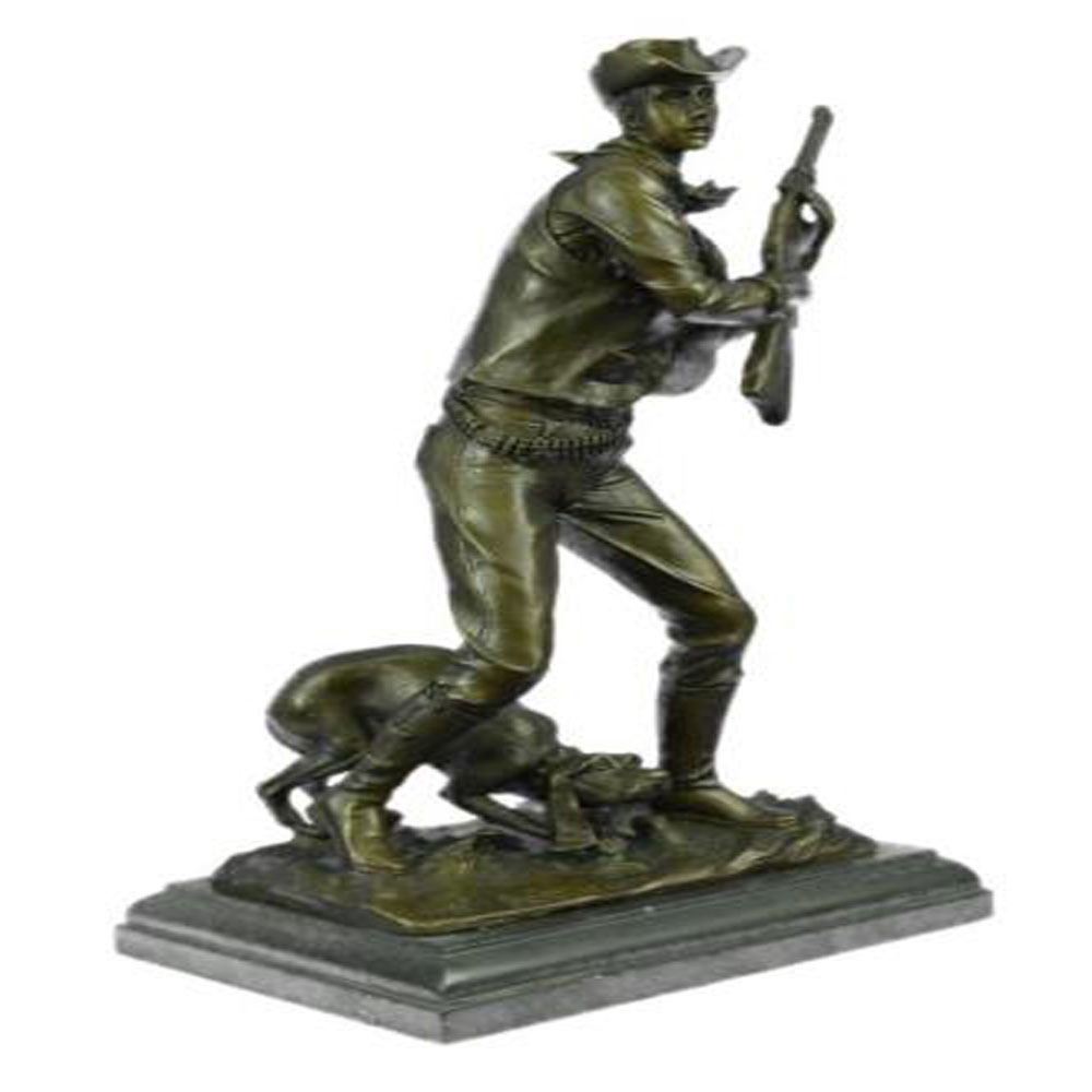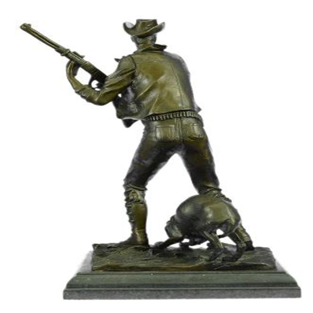 The cowboy stands, mouth agape, with his herding dog in the thin light of the moon that covers the landscape. He was awoken from his rest after a hard day of pushing a herd of cattle across the extensive grassy plains. He investigates the peculiar sound with his loyal dog, gun in hand, only to be taken by surprise by something moving in the shadows. The handmade Bronze Sculpture was cast using the ageold method of lost wax casting and stained with a brown patina finish for preservation. They are mounted upon a black marble base. Bronze Dimensions with Marble Base: Height 19 X Width 12 inches. Weight: 27 LBS.