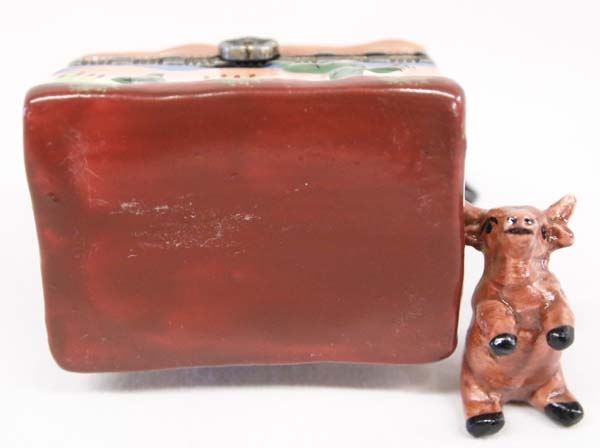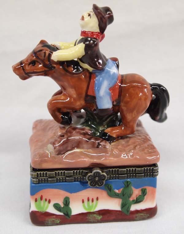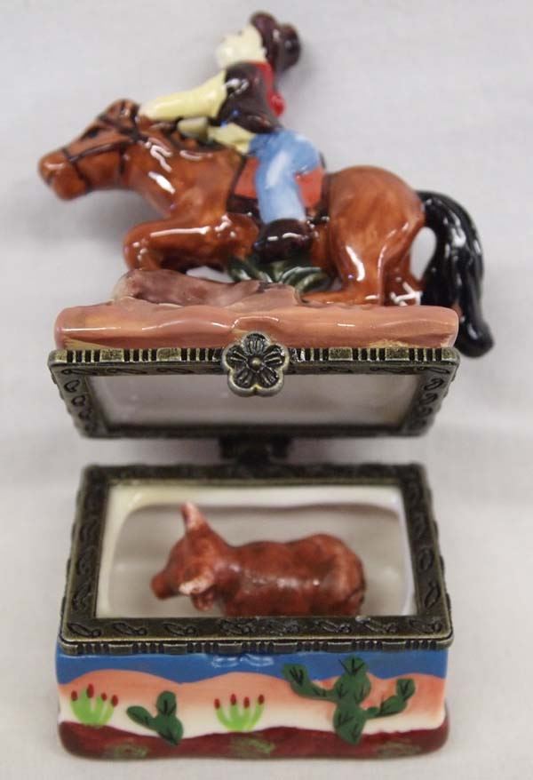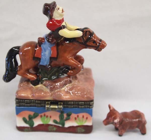Western Cowboy on Horse Porcelain Trinket Box, measures 3.5'' x 2'' x 1'', hinged lid, comes with additional small cow