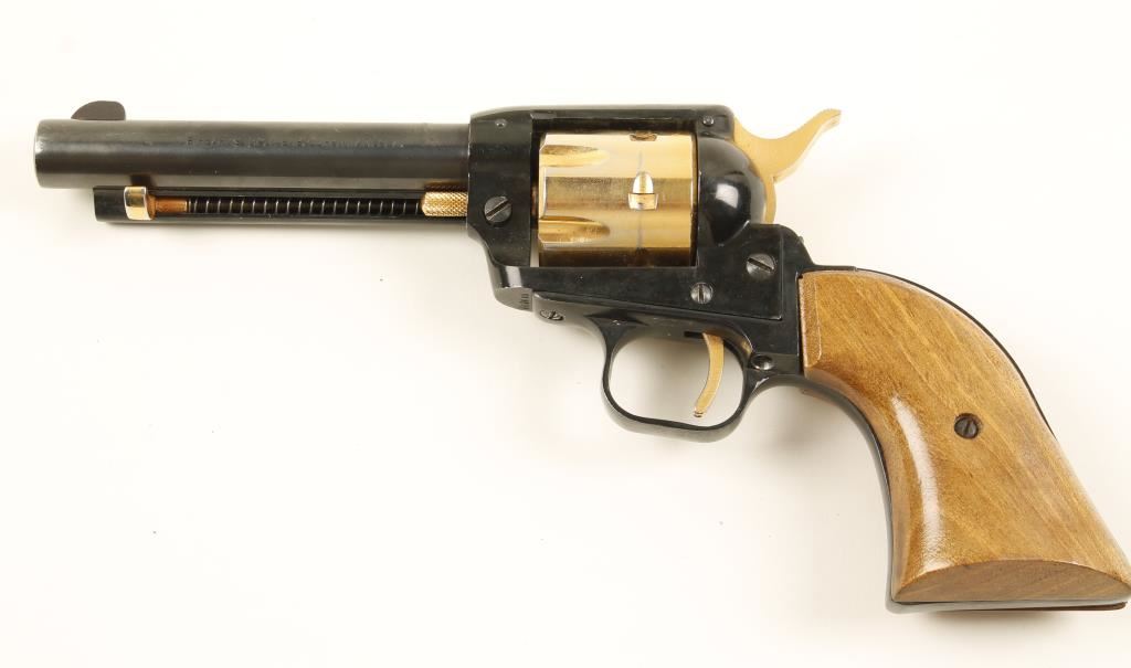 Revolver Shiny Black Finish with gold cylinder , trigger , and hammer. 4 1/2" BBL., Wood grips that are ill fitting. Condition: Fair to good use and high edge wear,cylinder drag marks. Action does not work. Modern Firearm*