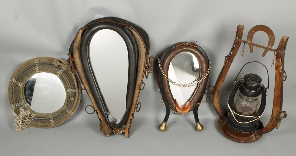 2 Horse collar mirrors, 1 round rope mirror, and 1 handmade kerosene lamp.