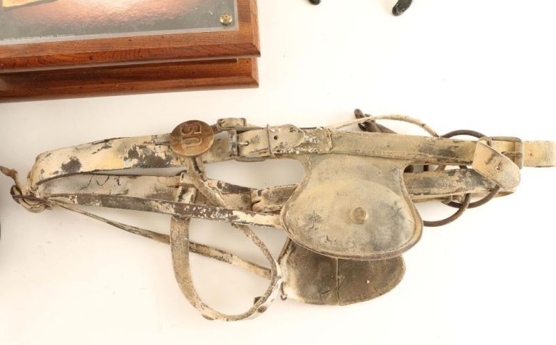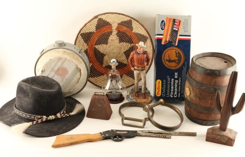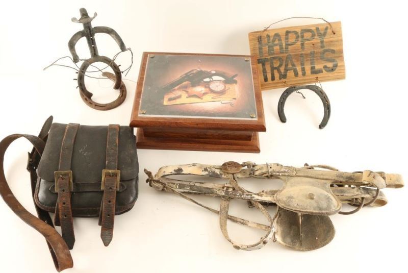 Including barrel, boat decanter, canteen, leather pouch, basket, cowboy horseshoe sculpture, Us marked headstall, cowboy hat, gun box, Colt knife, toy gun, Happy Trail sign, Colt cufflinks, gun cleaning kit, stirrups, ironwood cactus.