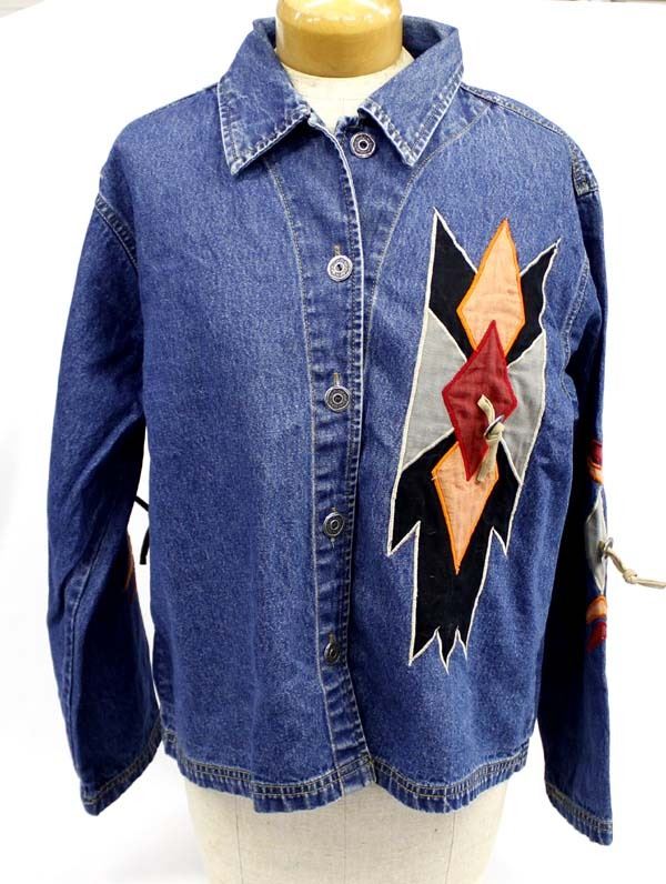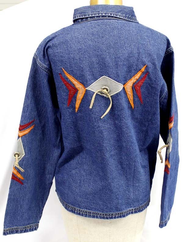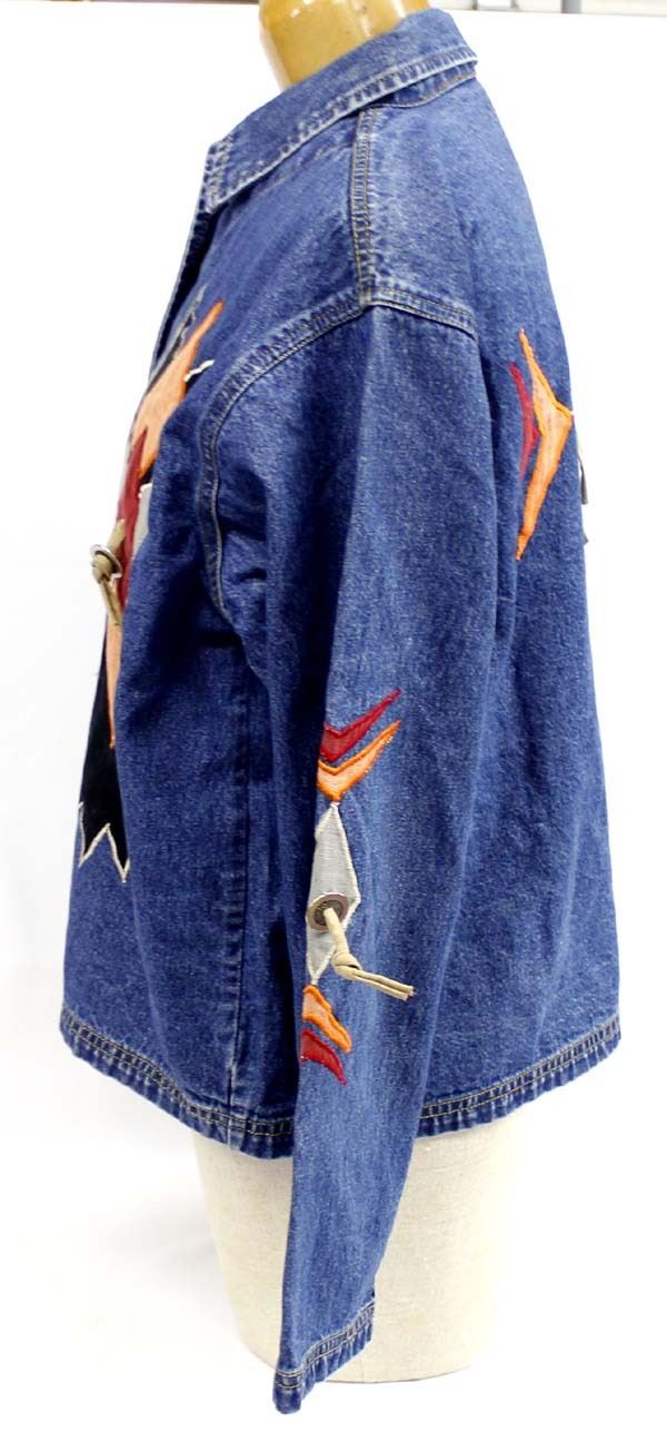 Size L, measures 44'' bust, 23'' length, Ultimate Philadelphia blue denim jacket with embroidered patches on front, arms, and back