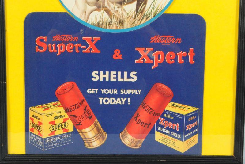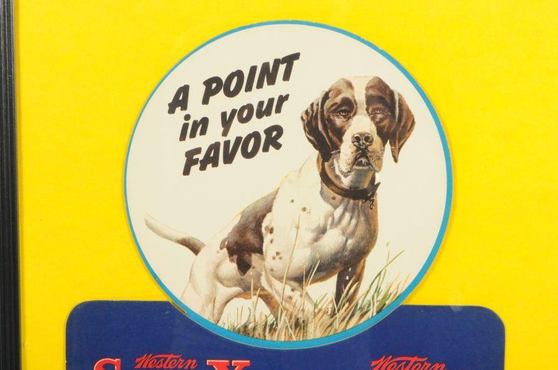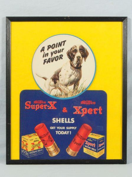 Western Die-Cut Store Ad Super X and Expert Shotgun Shell Store Display With Dog Inserted Round Top "Point in Your Favor". Measures 14" x 20.5" Mint Condition. New Old Stock