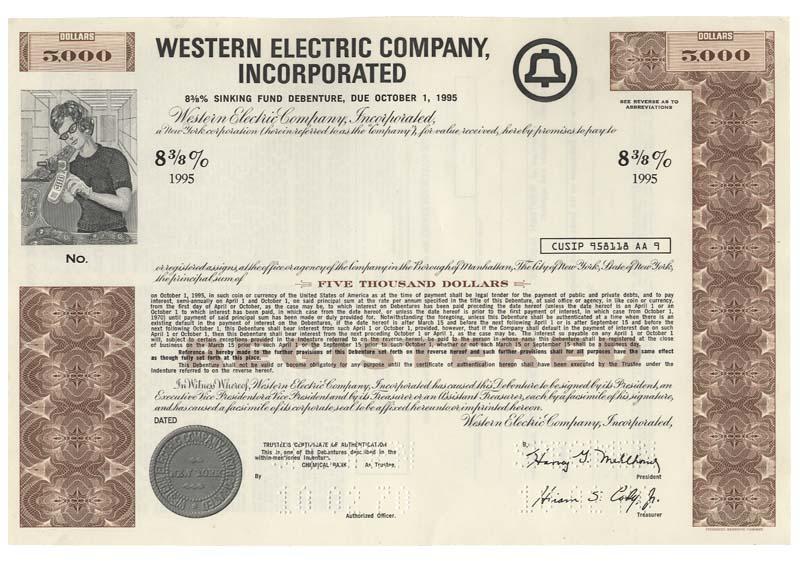 1970, New York. A $5,000 bond bearing 8 3/8% interest. Brown. Upper left vignette of a woman holding a phone. Lightly punch cancelled and Excellent.