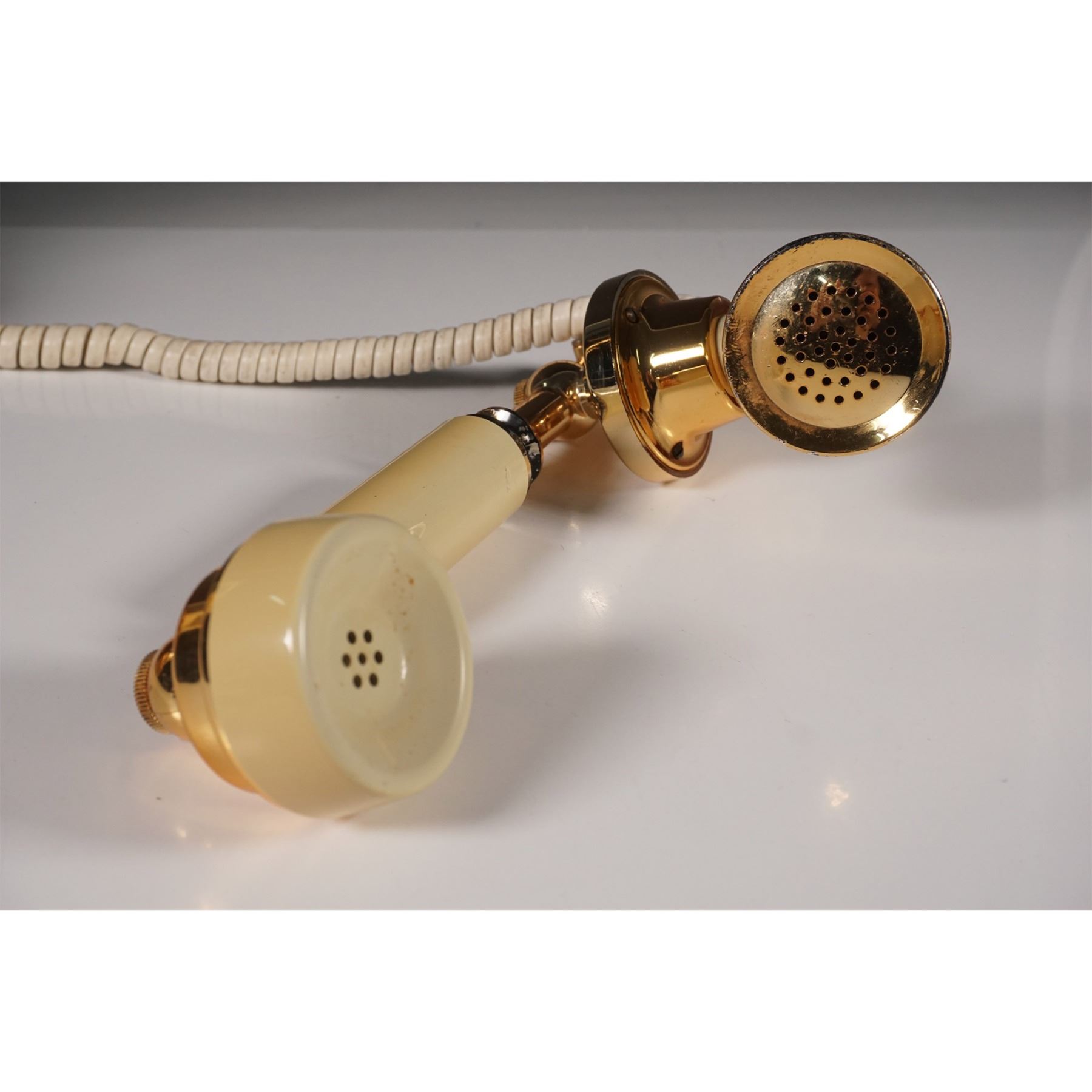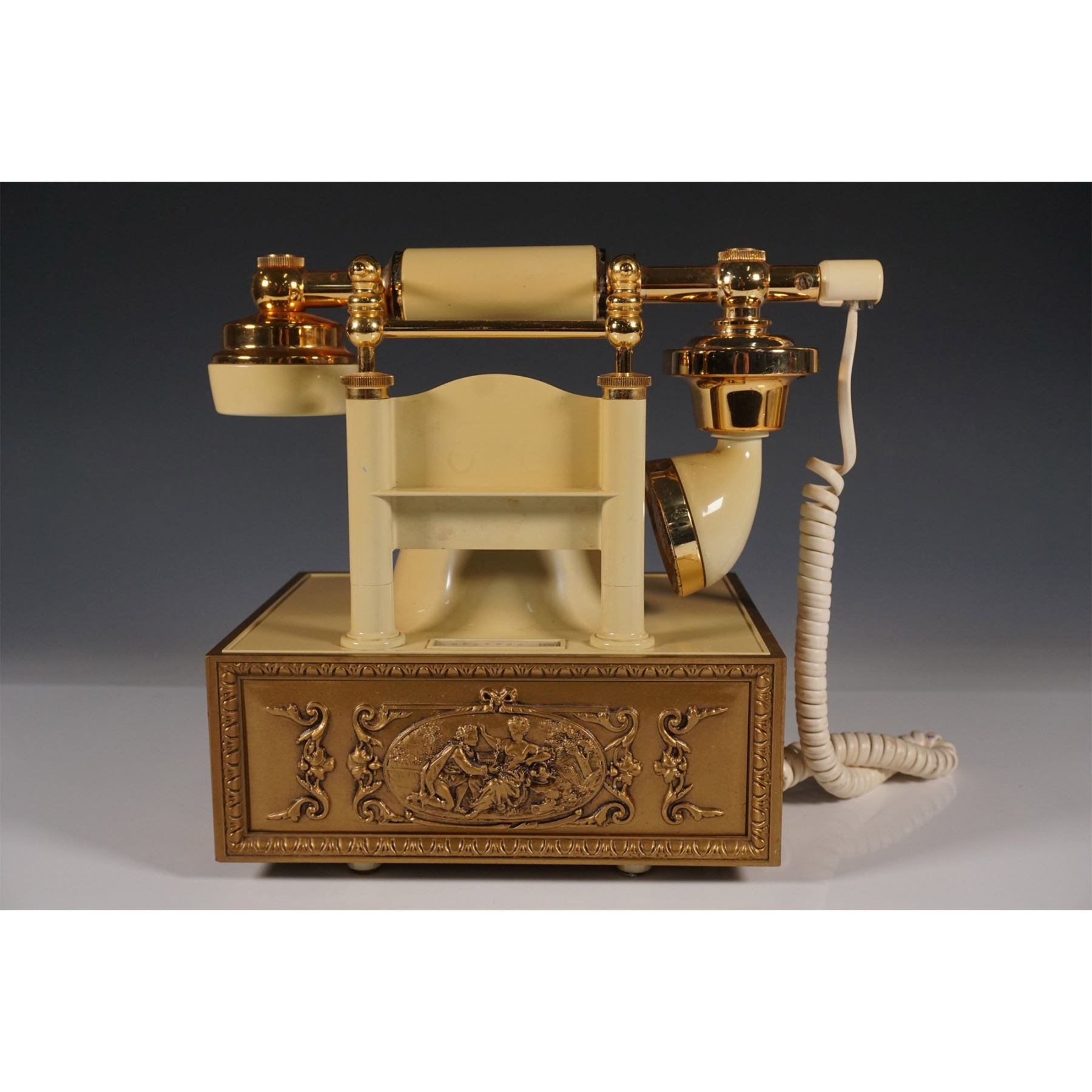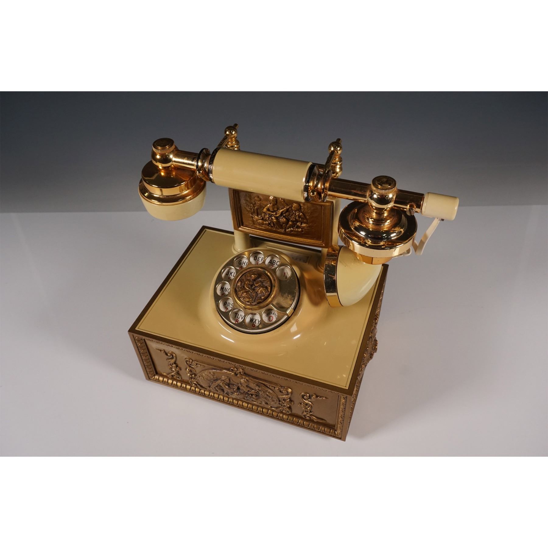 Vintage Western Electric rotary telephone featuring an ornate cream and gold design. The telephone showcases intricate relief artwork on its base and dial, evoking a classical aesthetic. The rotary dial includes metal accents with clear numbering, and the handset features a gold-tone mouthpiece with a cream-colored earpiece. Manufactured by Western Electric, this collectible telephone retains its original wiring and components. A striking display piece that blends functionality with elegant vintage appeal.
