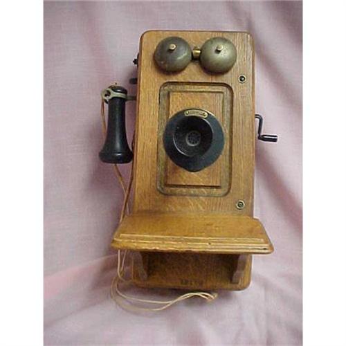 A wooden wall mounted hand-cranked telephone. The wall-mounting base measures 19 inches by 9 inches while the telephone box itself measures 17 ½ inches by 8 inches by 4 inches deep. The wood appears to be oak and is built with dovetailed joints. The outside of the box has a dual bell at the top center, a hinged mouthpiece in the center, a shelf at the lower center, a hand crank on the right side and a receiver holder with receiver on the left as well as the thumbscrew incoming line connector. The front is hinged on the left and held closed with screws set into metal screw holes. There is a brass plate on the front of the mouthpiece that reads ?Western Electric, Made in USA, Pat in USA Jan 14 1913?. The back of the mouthpiece reads ?KELLOG-CHIUCAGO.U.S.A.; PAT?D Nov. 26, 1901 and the bottom of the case front has incised into the wood ?2811H?. The wood finish appears to be original, is a golden oak tone, worn with dirt in the crevices, and the only cracks and gouges are on the back of the mounting plate. There are no cracks or scratches visible on the front. The black paint is worn from the metal parts of the mouthpiece where it would be held by hand. Although it is obviously well used everything appears to be in good shape save the fraying of the fabric covered external wiring. The crank turns, the generator hums and the bells ring.