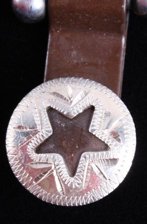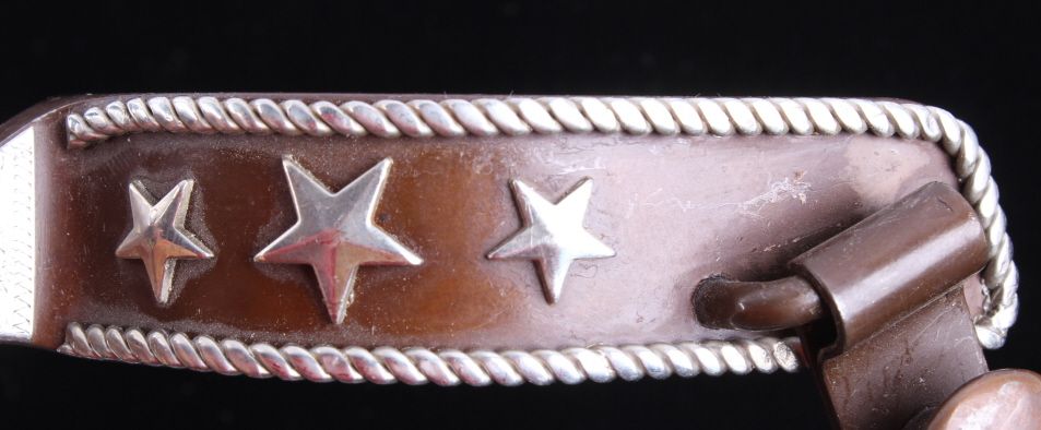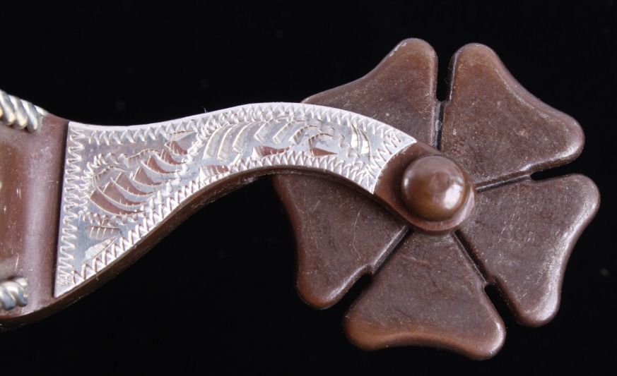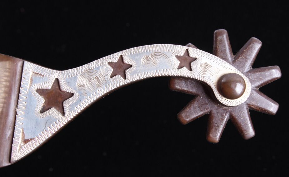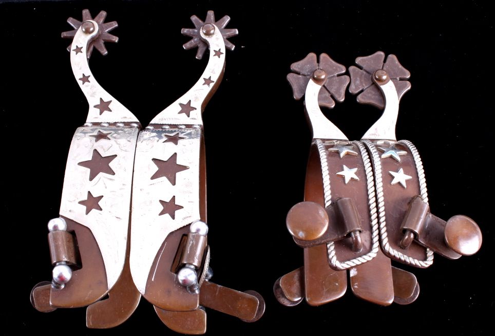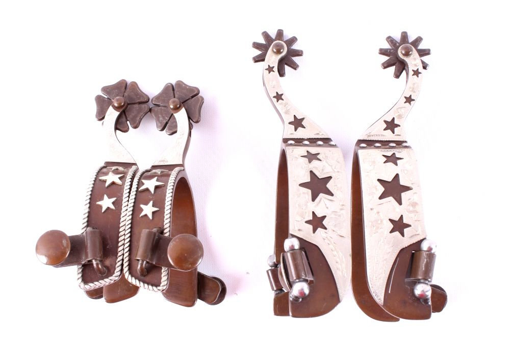 The lot features two sets of single mounted western cowboy spurs. The one set has a clover rowels with mounted silver (not tested) etched design, rope work and stars. The other set shows a single mounted etched design with stars. Both are in good condition. Larger measures 6.75"x4 1/8" smaller set 5 3/8"x3 5/8"