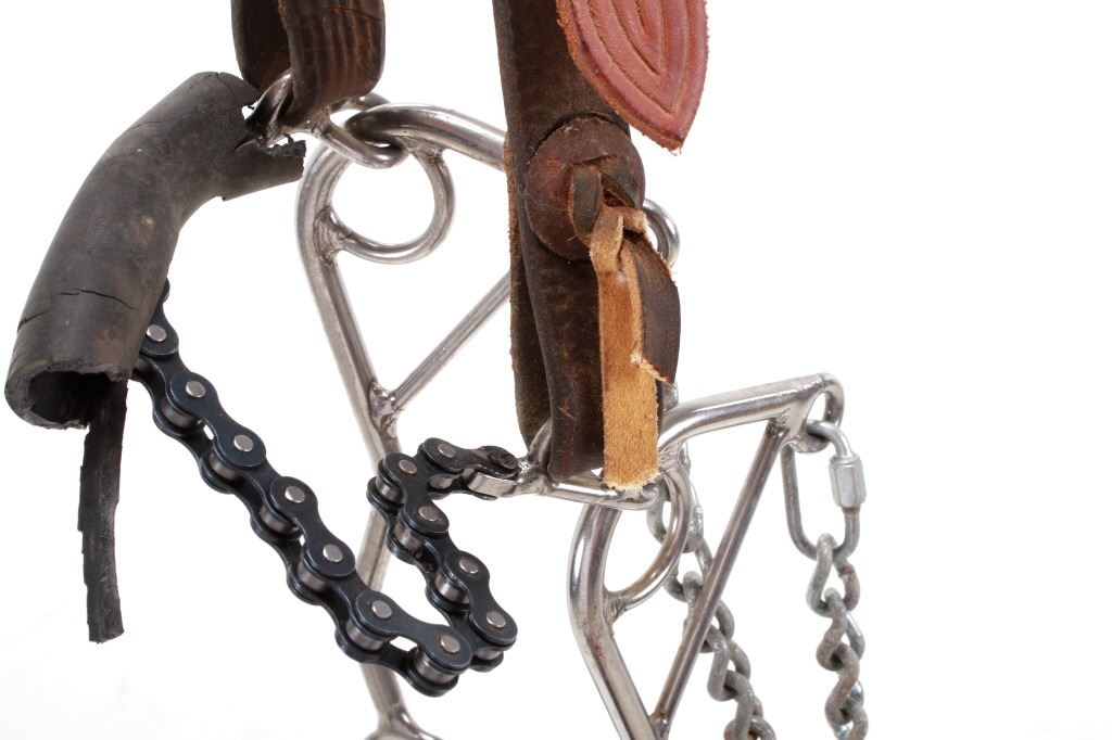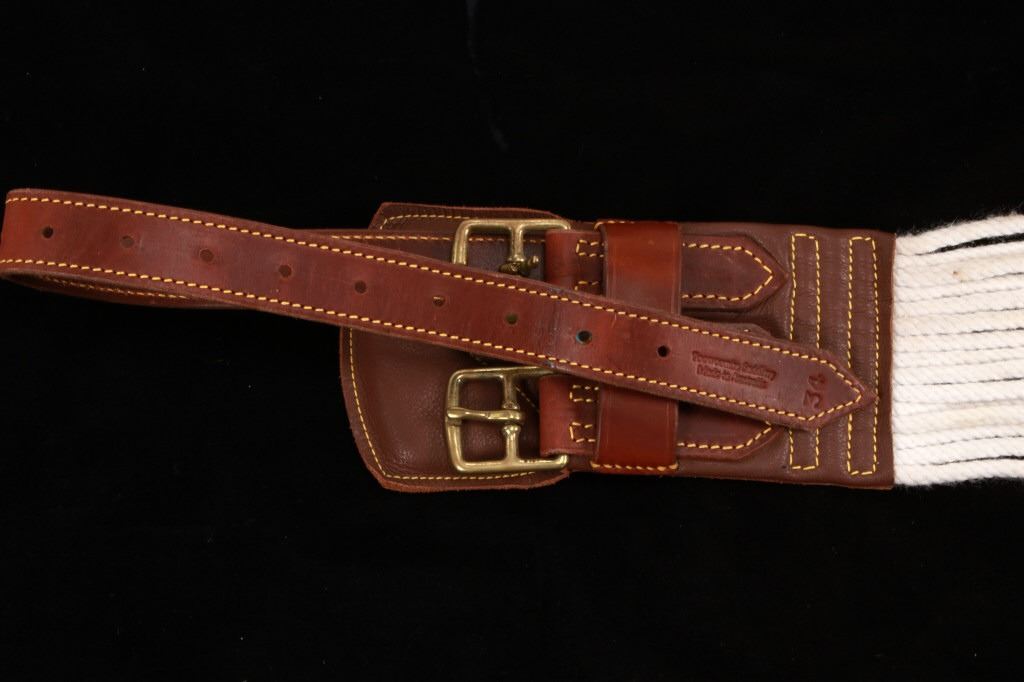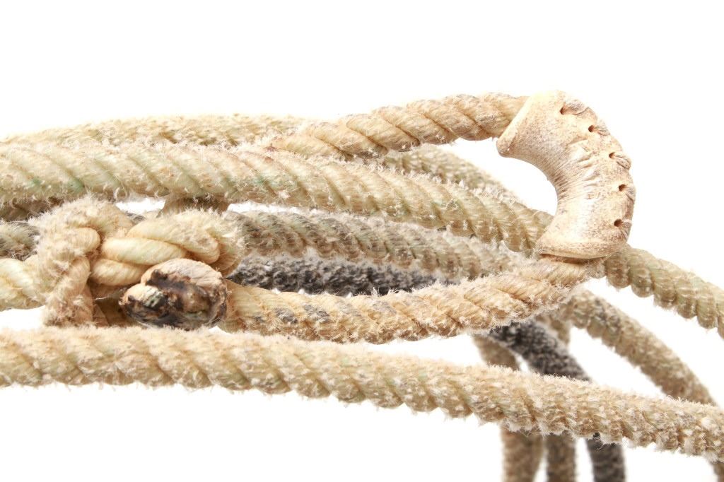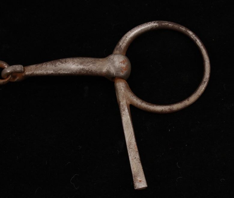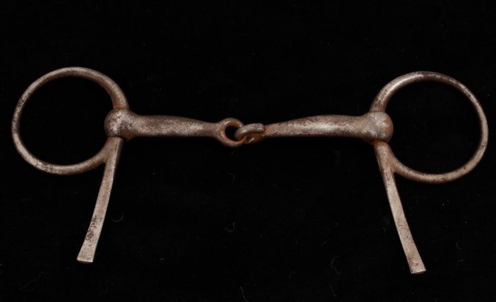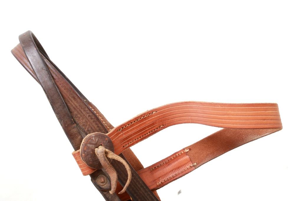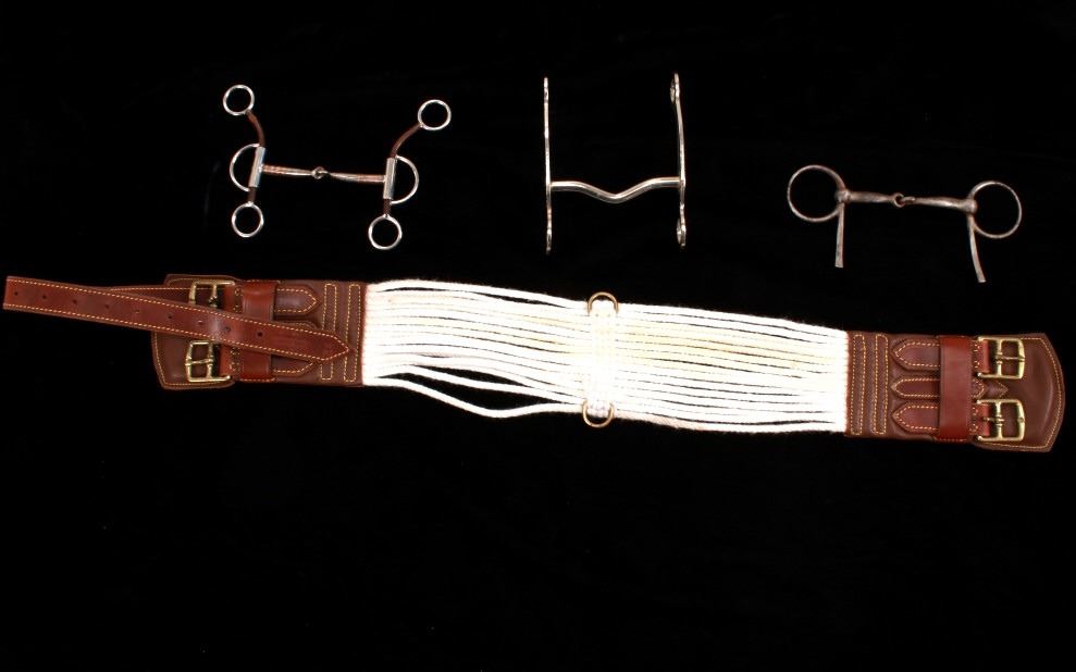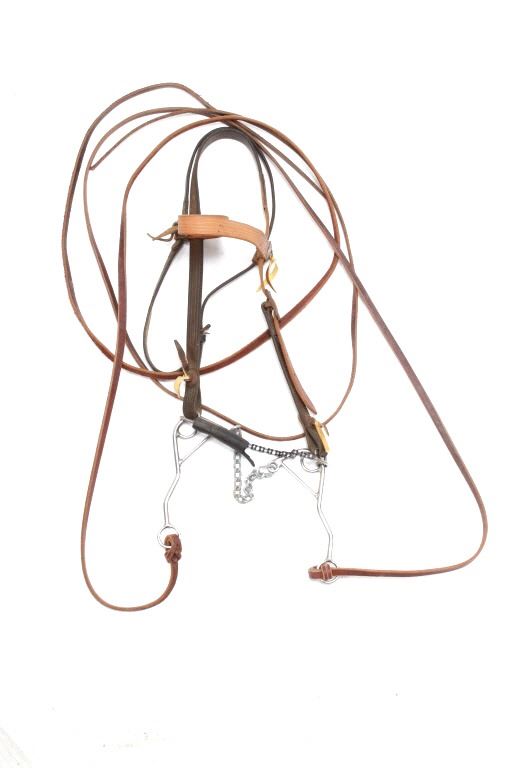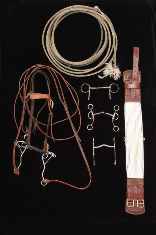 Featured in this lot is this collection of Western Equestrian tack, circa mid to late 1900's. There are six total items in this collection. The first is a mechanical hackamore with a beautiful headstall. The second item is a used team roping nylon rope. The third item is a beautiful and professionally crafted belly cinch. The last three items feature shanked bit construction, with two of them showing swivel snaffle construction to the design and the larger showing a shanked curb bit construction. The condition of this this collection is good, with no obvious signs of damage. The headstall is full size, with the measurements of the bits ranging from 6" x 6 1/2" x 3" to 5 1/2" x 7 1/2" x 3". The belly cinch measurements are 42 1/2” x 4 1/4".