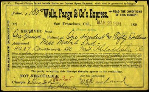Western Express Companies. Group of five partly-printed receipts, 1894-99, of Pacific Express, Adams Express, and Wells Fargo, the latter from San Francisco, Chicago, and Grass Valley, Calif. Some with edge wear. Also with manuscript letter on Wells Fargo letterhead, 1872, from Sheridan (Wyoming) to customer in Portland, Oregon. T.L.S. from Mandel Bros., Chicago, 1900, to Wells Fargo, to notify agent in Salida, Colorado. Very good.