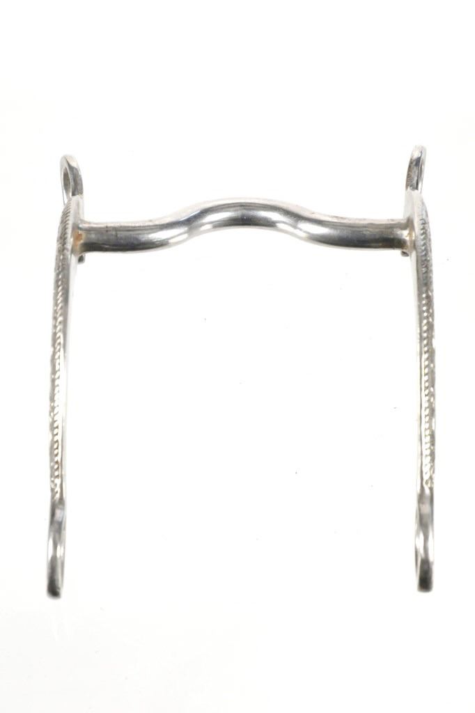 Featured in this lot is this western feather shank medium port bridle bit circa 20th century. The bit features a wonderfully and professionally crafted stainless steel construction that shows a decorated shank that shows a western feather pattern with a fixed shank and a medium port curb. This is an unmarked western bit. The condition of this western curb shank bit is well preserved with no obvious signs of damage and shows a well preserved condition. The measurements of this of this bit is 7 1/2" x 6" x 3". The collective weight of this bridle bit is 14oz.
