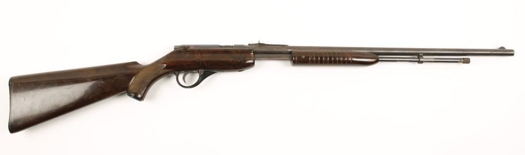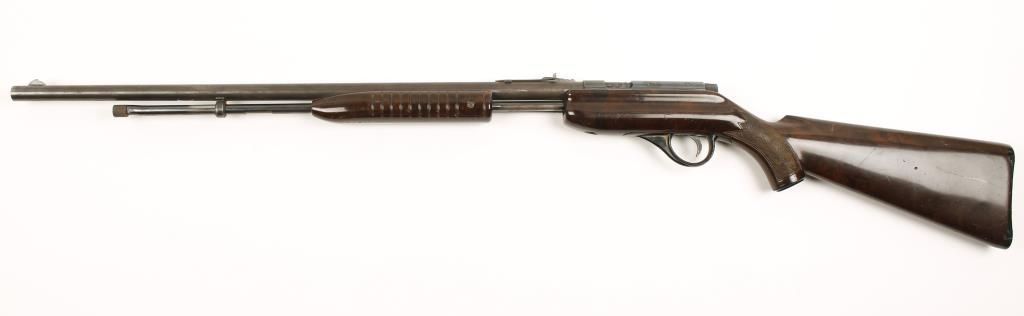 Scarce ans seldom seen pump-action Tenite stocked tube magazine rifle. Made by Noble in the 1940s and '50s. Action functions like a Stevens Visible Loader with the mag tube moving with the pump handle. Stock has a few scratches and scrapes mostly on the high points. 24" barrel has faded and has light surface rust spots. The bore is bright with strong rifling. The barrel has been worn to the white where the action has been worked. Rear sight adjustable for windage and elevation. Condition is good. *Curio & Relic*