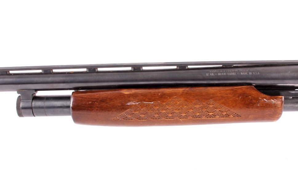 This is a Western Field Model M550AL pump action shotgun chambered for 12 gauge with a screw in choke. The shotgun features a blued steel vented barrel with deluxe solid walnut hardwood checkered stocks. Both side of the receiver are engraved with a bird hunting scene. The bottom of the receiver is marked "Western Field Made in U.S.A. Montgomery Ward M550AL 12 GA". The left side of the barrel is marked "Chambered for 2 3/4" and 3" Mag. 12 GA. -Accu-Choke-Made in U.S.A.". The shotgun is in good condition. It measures 48" long. Serial number is H335668. This firearm requires an FFL Transfer or a NICS Background Check.