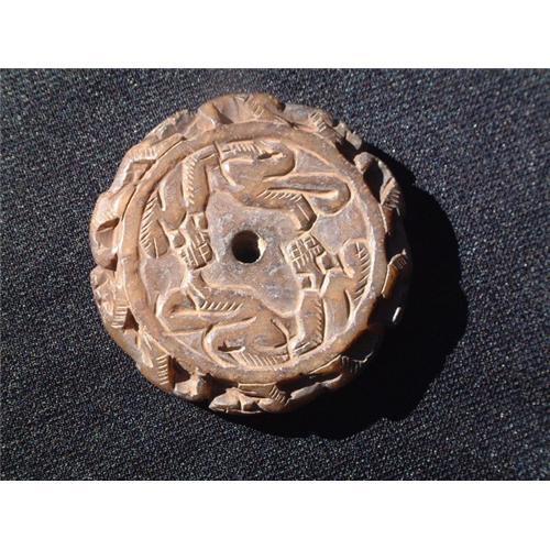Western Han period yellowish-brown hardstone decorated with 2 facing dragons. The edge is decorated with a row of dragons. Diameter: 2"(5 cm.).