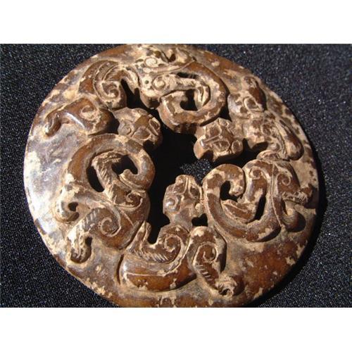 1st. century BCE round plaque jade ornament decorated with 3 dragons in high relief on the obverse side that is convex. The reverse side is decorated in bas relief and has a central round depression. This is an exquisite carving in open work and high relief in green jade that now has age partial calcination. Diameter: 3" (7.5 cm.). Provenance: Dr. Veleanu's jade collection, the author of collectors textbook: "Jade, 5000 BC to 1912 AD, Guide to collectors". Estimated retail value: $1400.