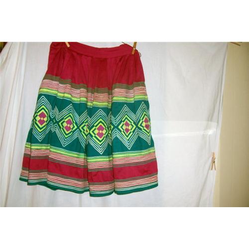 Great patchwork, tiny rick rack, and great colors. The patchwork is hand pieced, and probably Seminole done, but it could be log cabin. At least it is a great piece of wearable folk art. The skirt is 25 inches from waist to hem, 32 inches in the waist, and the skirt is 84 inches full around. Ca. 1930's, would look great with cowboy boots, and a peasant top. Thank you for shopping in the land of Enchantment!
