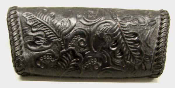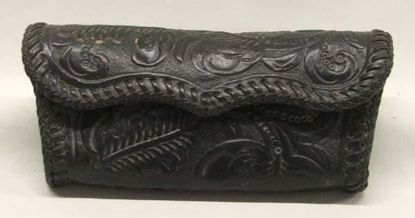 Western Hand Tooled Glass Case By Mi Mo Jo, measures approx. 3 1/3''H x 6 1/3''L x 1 3/4''D. Buyers Pay Actual Shipping and Handling Charges(see terms and conditions for more information).