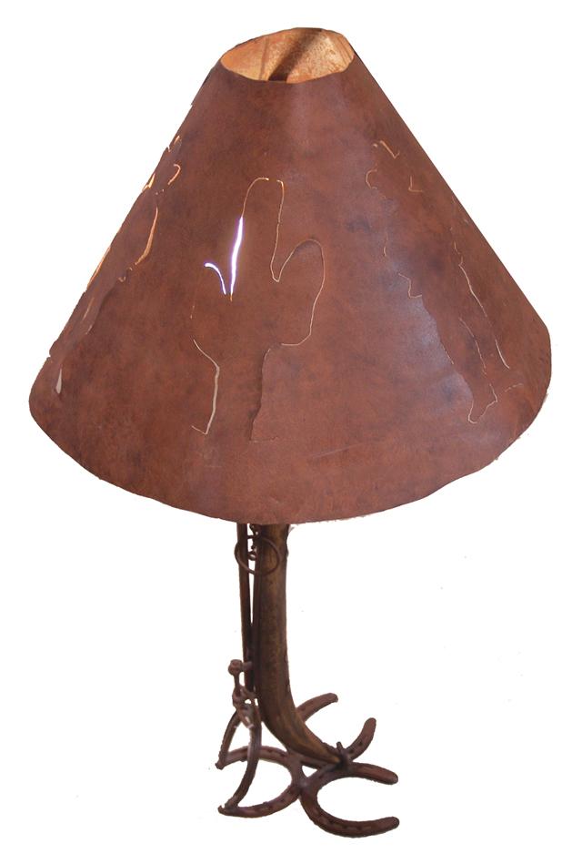 Circa 1970, Made from a wooden harness part with horseshoe base and custom shade, with cowboys and saguaro cactus. Lamp 36" x 9, shade 16" x 22"