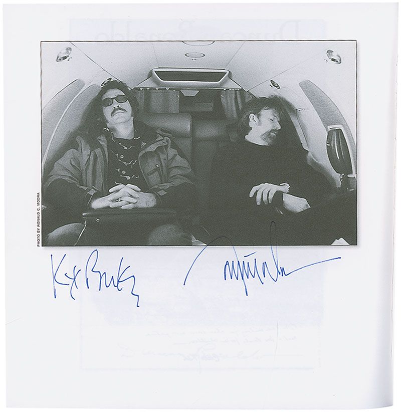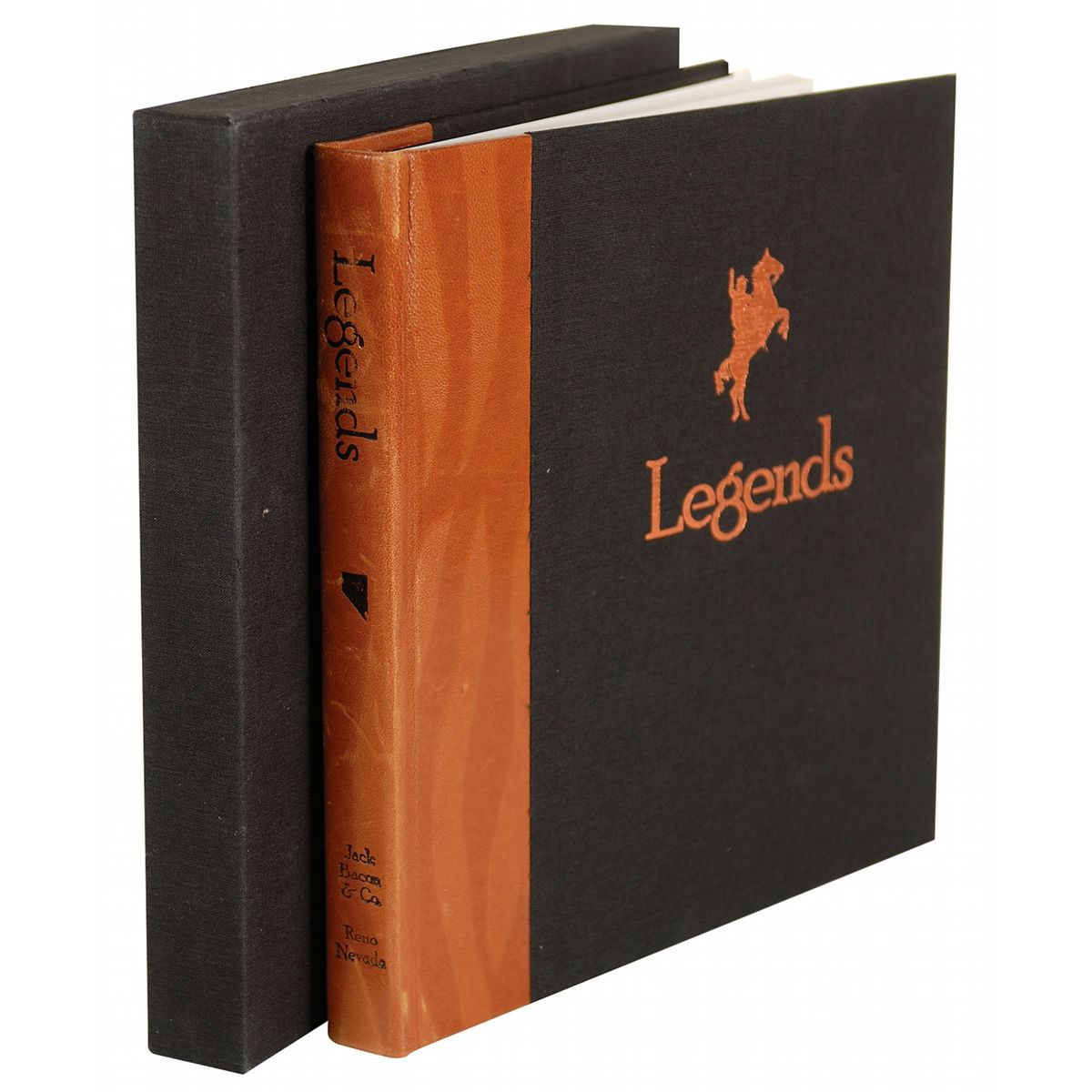 Signed book: Legends. Limited edition first edition, #121/250. Nevada: Jack Bacon & Company, 2006. Hardcover with original slipcase, 9.25 x 9.25. Signed in ink throughout the pages of the book by 46 western stars and notables. Signers are: James Arness, Eddy Arnold, Irene Bedard, Powers Boothe, Brooks & Dunn, Red Buttons, Harry Carey, Jr., Roy Clark, Lacy J. Dalton, Charlie Daniels, Jack Elam, Sam Elliot, Rhonda Fleming, Lou Glanzman, Lee Greenwood, Monte Hale, Emmylou Harris, Harry Jackson, Adam Jahiel, Stuart Kaminski, Frankie Laine, Trini Lopez, Barbara Mandrell, Kevin McCarthy, The Oak Ridge Boys (4), Hugh O’Brian, Riders in the Sky (4), Julie Ritter, Dale Robertson, Mickey Rooney, The Statler Brothers (4), Mel Tillis, Randy Travis, Eli Wallach, Dennis Weaver, and Adam West. In fine condition.
