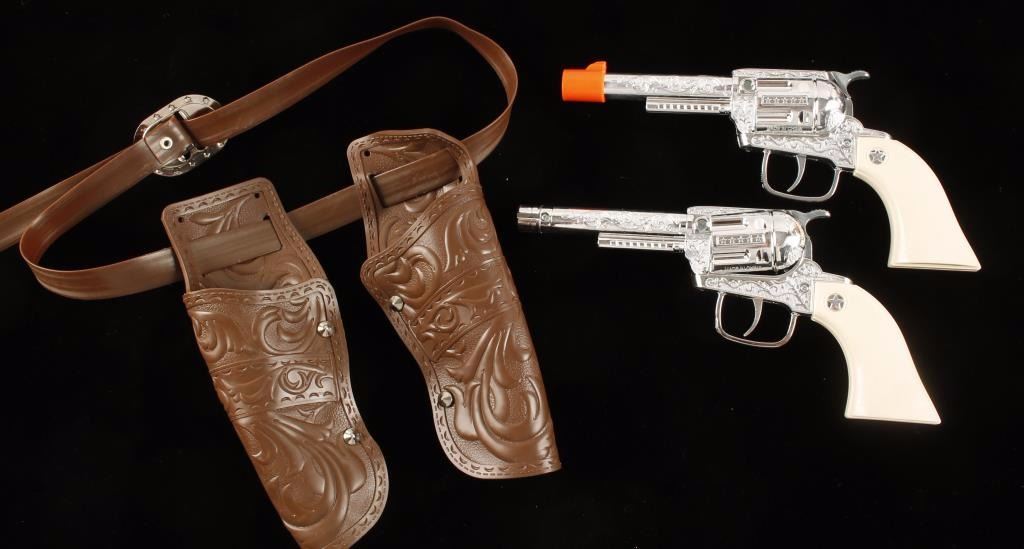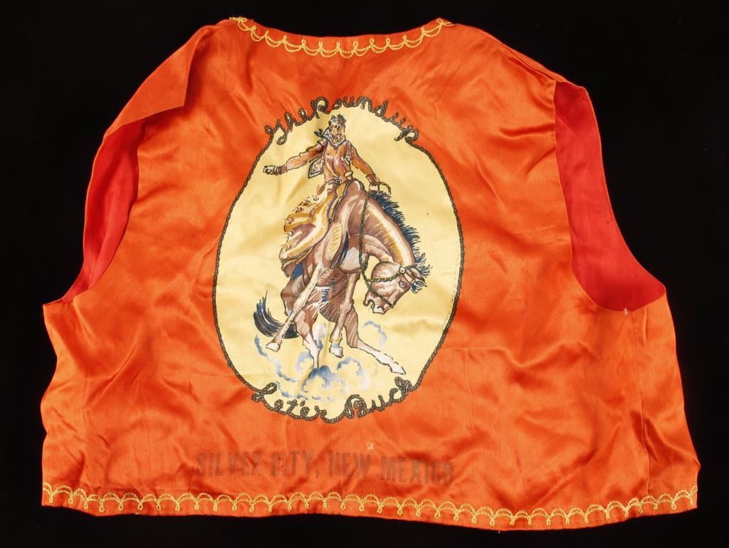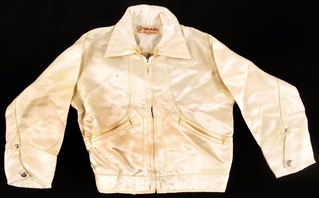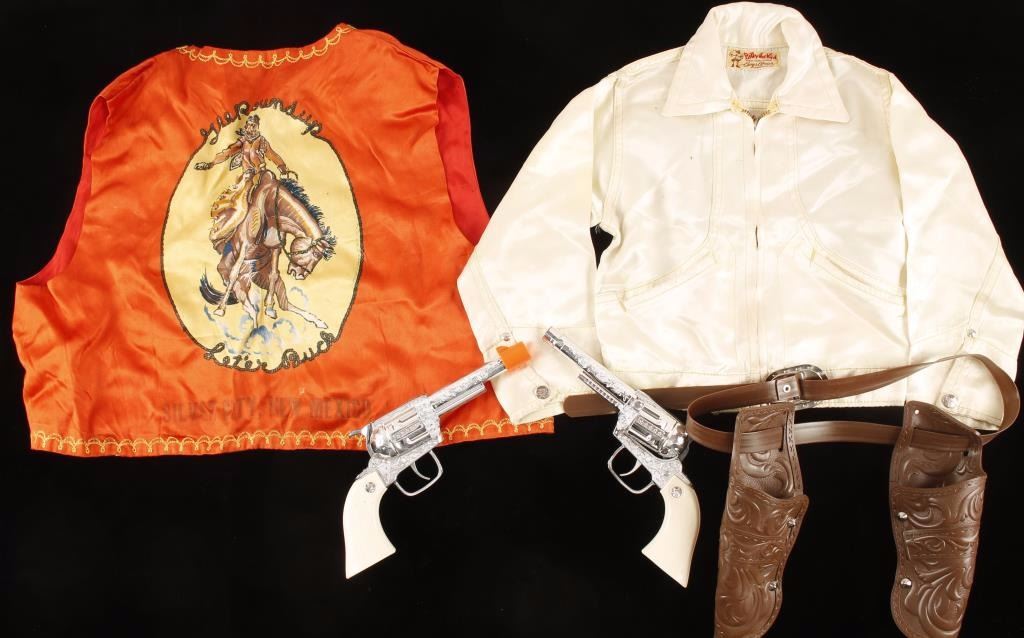 Including: Child's Western dress set with 'Billy the Kid' silk zip up jacket, 'The Roundup Leter Buck' red silk vest with gold stitching around edges and cowboy with bucking bronc on the back, plastic gun belt with two holsters and revolvers