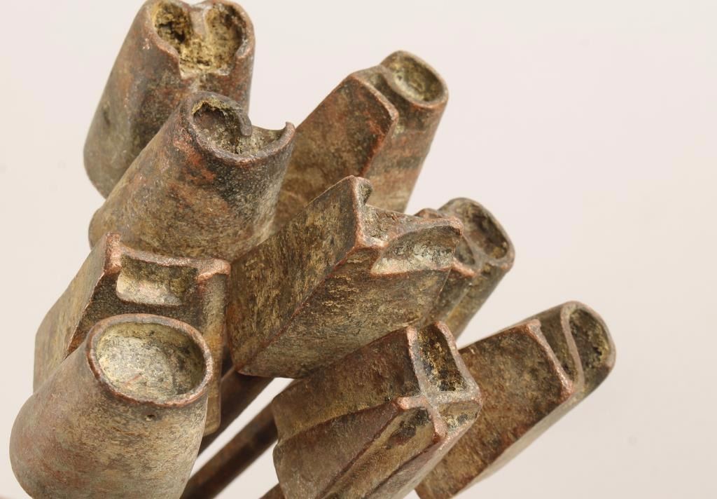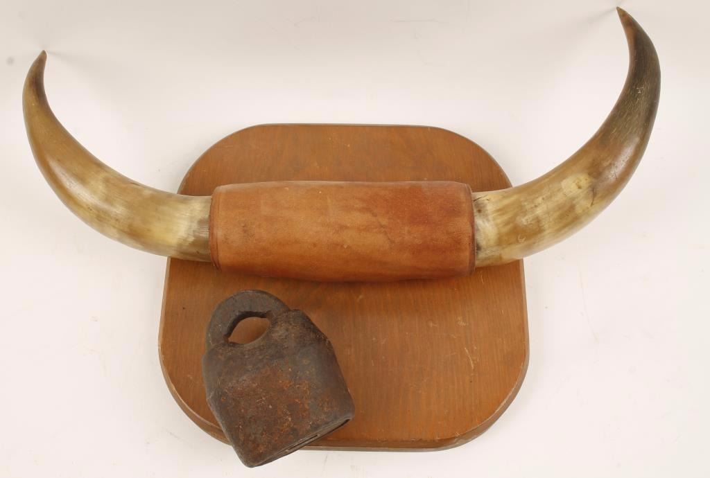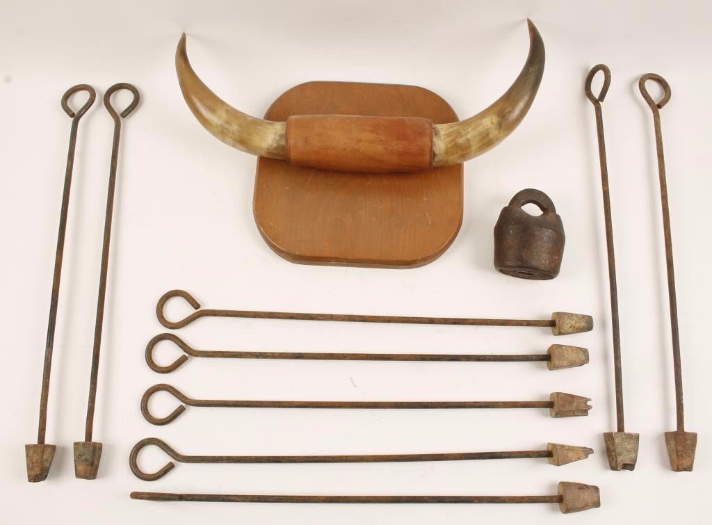 9 branding irons of individual numbers, steer horns mounted on wood and wrapped in leather and a cow bell. Giddyup!